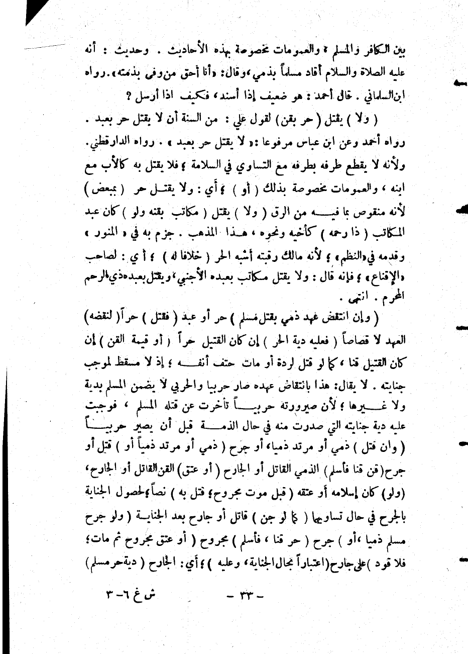 . (وَلَا) يُقْتَلُ (حُرٌّ بِقَنٍّ) ؛ لِقَوْلِ عَلِيٍّ: مِنْ السُّنَّةِ أَنْ لَا يُقْتَلَ حُرٌّ بِعَبْدٍ. رَوَاهُ أَحْمَدُ