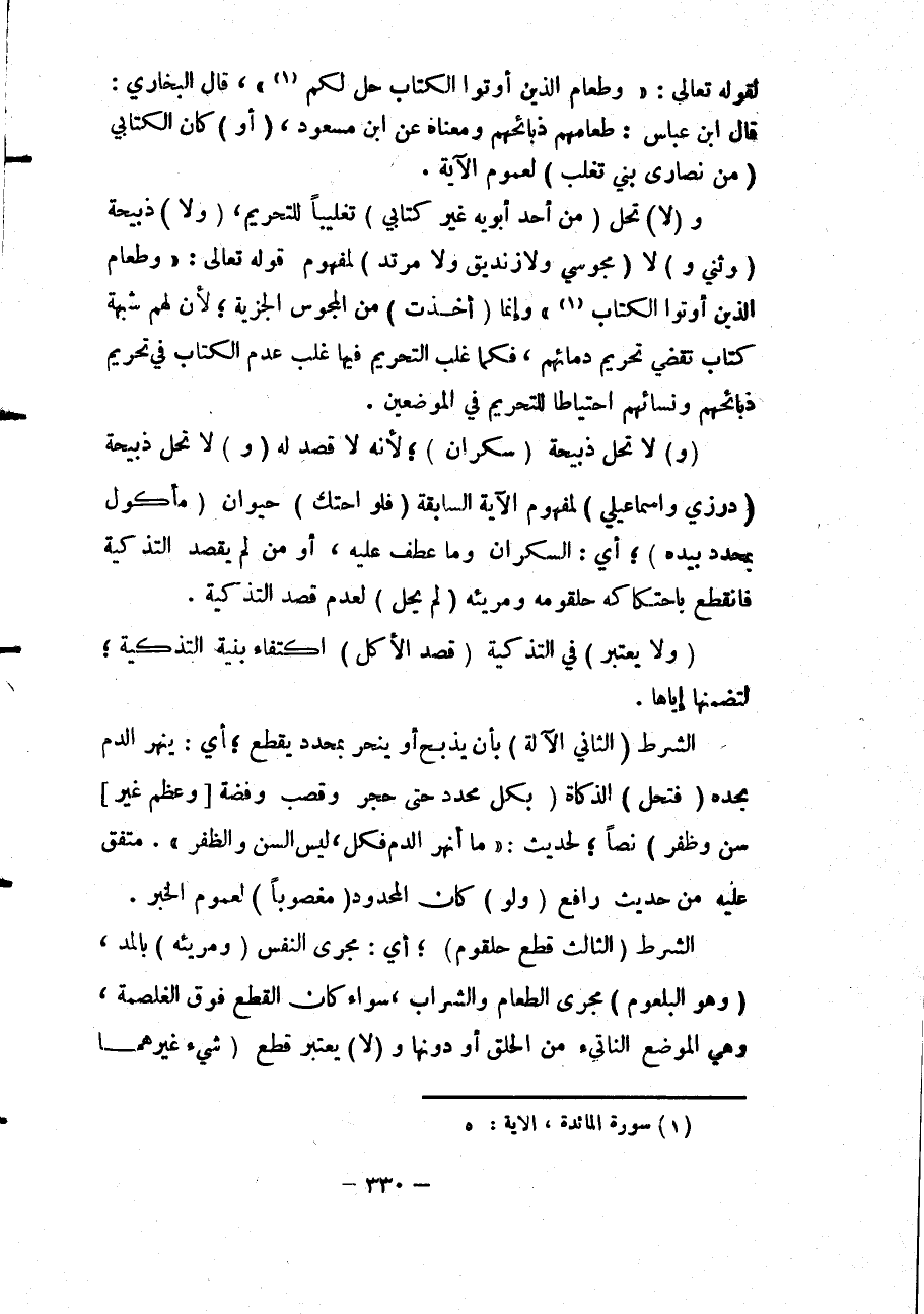 لِقَوْلِهِ تَعَالَى: {وَطَعَامُ الَّذِينَ أُوتُوا الْكِتَابَ حِلٌّ لَكُمْ} [المائدة: 5] ، قَالَ الْبُخَارِيُّ: قَالَ ابْنُ عَبَّاسٍ: طَعَامُهُمْ ذَبَائِحُهُمْ وَمَعْنَاهُ عَنْ ابْنِ مَسْعُودٍ، (أَوْ) كَانَ الْكِتَابِيُّ (مِنْ نَصَارَى بَنِي تَغْلِب) لِعُمُومِ الْآيَةِ.