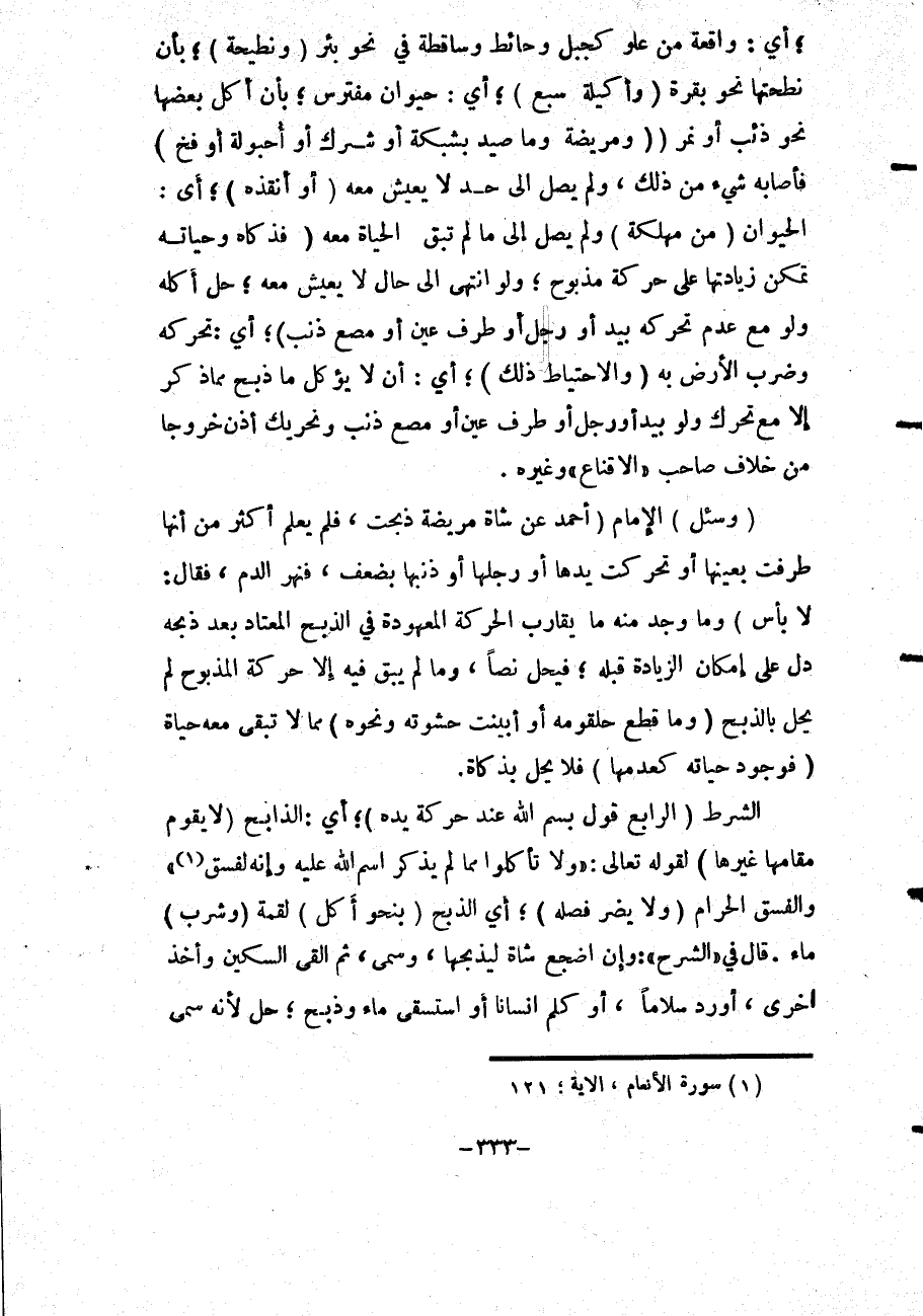 (وَسُئِلَ) الْإِمَامُ أَحْمَدُ عَنْ شَاةٍ مَرِيضَةٍ ذُبِحَتْ، فَلَمْ يُعْلَمْ أَكْثَرُ مِنْ أَنَّهَا طَرَفَتْ بِعَيْنِهَا أَوْ تَحَرَّكَتْ يَدُهَا أَوْ رِجْلُهَا أَوْ ذَنَبُهَا بِضَعْفٍ، فَنَهَرَ الدَّمُ، فَقَالَ: لَا بَأْسَ وَمَا وُجِدَ مِنْهُ مَا يُقَارِبُ الْحَرَكَةَ الْمَعْهُودَةَ فِي الذَّبْحِ الْمُعْتَادِ بَعْدَ ذَبْحِهِ دَلَّ عَلَى إمْكَانِ الزِّيَادَةِ قَبْلَهُ؛ فَيَحِلُّ نَصًّا، وَمَا لَمْ يَبْقَ فِيهِ إلَّا حَرَكَةُ الْمَذْبُوحِ لَمْ يَحِلَّ بِالذَّبْحِ (وَمَا قُطِعَ حُلْقُومُهُ أَوْ أُبِينَتْ حَشْوَتُهُ وَنَحْوُهُ) مِمَّا لَا تَبْقَى مَعَهُ حَيَاةٌ (فَوُجُودُ حَيَاتِهِ كَعَدَمِهَا) فَلَا يَحِلُّ بِذَكَاةٍ.