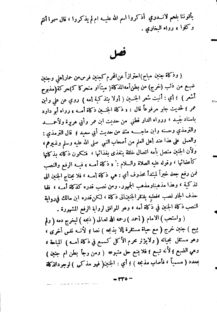 فَصْلٌ (وَذَكَاةُ جَنِينٍ مُبَاحٍ) احْتِرَازًا عَنْ الْمُحَرَّمِ كَجَنِينِ فَرَسٍ مِنْ حِمَارٍ أَهْلِيٍّ وَجَنِينِ ضَبُعٍ مِنْ ذِئْبٍ (خَرَجَ) مِنْ بَطْنِ أُمِّهِ الْمُذَكَّاةِ (مَيِّتًا أَوْ مُتَحَرِّكًا كَ) حَرَكَةِ (مَذْبُوحٍ أَشْعَرَ) ؛ أَيْ: أَنْبَتَ شَعْرُ الْجَنِينِ (أَوْ لَا بِتَذْكِيَةِ أُمِّهِ) رُوِيَ عَنْ عَلِيٍّ وَابْنِ عُمَرَ؛ لِحَدِيثِ جَابِرٍ مَرْفُوعًا قَالَ: «ذَكَاةُ الْجَنِينِ ذَكَاةُ أُمِّهِ» رَوَاهُ أَبُو دَاوُد بِإِسْنَادٍ جَيِّدٍ، وَرَوَاهُ الدَّارَقُطْنِيّ مِنْ حَدِيثِ ابْنِ عُمَرَ وَأَبِي هُرَيْرَةَ وَلِأَحْمَدَ وَالتِّرْمِذِيِّ وَحَسَّنَهُ وَابْنِ مَاجَهْ مِثْلُهُ مِنْ حَدِيثِ أَبِي سَعِيدٍ، قَالَ التِّرْمِذِيُّ: وَالْعَمَلُ عَلَى هَذَا عِنْدَ أَهْلِ الْعِلْمِ مِنْ أَصْحَابِ النَّبِيِّ - صَلَّى اللَّهُ عَلَيْهِ وَسَلَّمَ - وَغَيْرِهِمْ، وَلِأَنَّ الْجَنِينَ مُتَّصِلٌ بِأُمِّهِ اتِّصَالَ خِلْقَةٍ يَتَغَذَّى بِغِذَائِهَا، فَتَكُونُ ذَكَاتُهُ بِذَكَاتِهَا كَأَعْضَائِهَا، وَقَوْلُهُ - عَلَيْهِ الصَّلَاةُ وَالسَّلَامُ -: «ذَكَاةُ أُمِّهِ» فِيهِ الرَّفْعُ وَالنَّصْبُ فَمَنْ رَفَعَ جَعَلَهُ خَبَرًا لِمُبْتَدَأٍ مَحْذُوفٍ أَيْ: هِيَ ذَكَاةُ أُمِّهِ، فَلَا يَحْتَاجُ الْجَنِينُ إلَى تَذْكِيَةٍ، وَهَذَا مَذْهَبُنَا وَمَذْهَبُ الْجُمْهُورِ.
