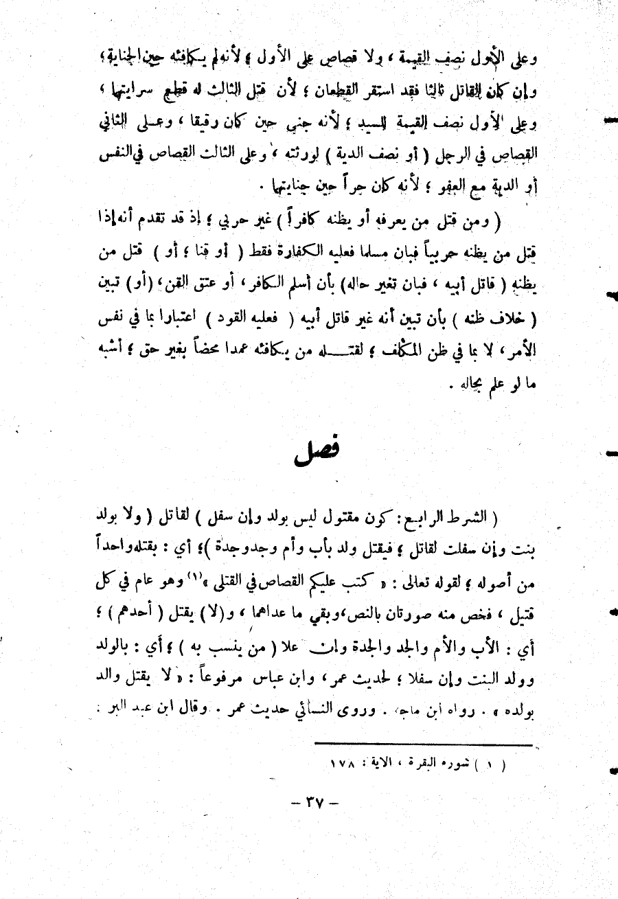 [فَصْلٌ مِنْ شُرُوط الْقِصَاص كَوْنُ الْمَقْتُولِ لَيْسَ بِوَلَدٍ وَإِنْ سَفَلَ لِقَاتِلٍ]