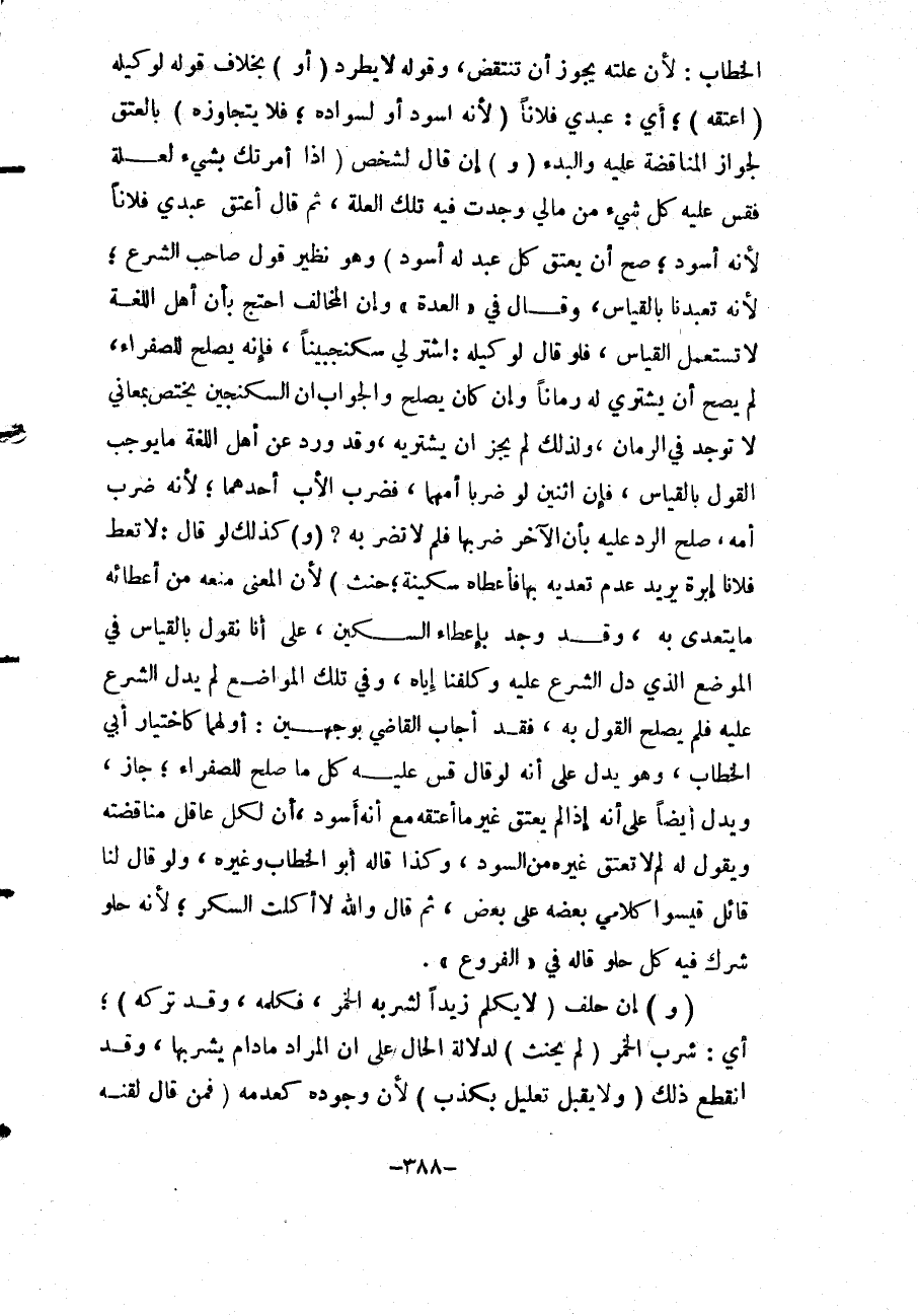 وَأَبُو الْخَطَّابِ: لِأَنَّ عِلَّتَهُ يَجُوزُ أَنْ تُنْتَقَضَ. وَقَوْلُهُ لَا يَطَّرِدُ (أَوْ) بِخِلَافِ قَوْلِهِ لِوَكِيلِهِ (اعْتِقْهُ) ، أَيْ: عَبْدِي فُلَانًا (لِأَنَّهُ أَسْوَدُ أَوْ لِسَوَادِهِ، فَلَا يَتَجَاوَزُهُ) بِالْعِتْقِ لِجَوَازِ الْمُنَاقَضَةِ عَلَيْهِ وَالْبَدْءِ (وَ) إنْ قَالَ لِشَخْصٍ (إذَا أَمَرْتُك بِشَيْءٍ لِعِلَّةٍ فَقِسْ عَلَيْهِ كُلَّ شَيْءٍ مِنْ مَالِي وَجَدْتُ فِيهِ تِلْكَ الْعِلَّةَ، ثُمَّ قَالَ اعْتِقْ عَبْدِي فُلَانًا؛ لِأَنَّهُ أَسْوَدُ، صَحَّ أَنْ يَعْتِقَ كُلَّ عَبْدٍ لَهُ أَسْوَدَ) وَهُوَ نَظِيرُ قَوْلِ صَاحِبِ الشَّرْعِ؛ لِأَنَّهُ تَعَبَّدَنَا بِالْقِيَاسِ.