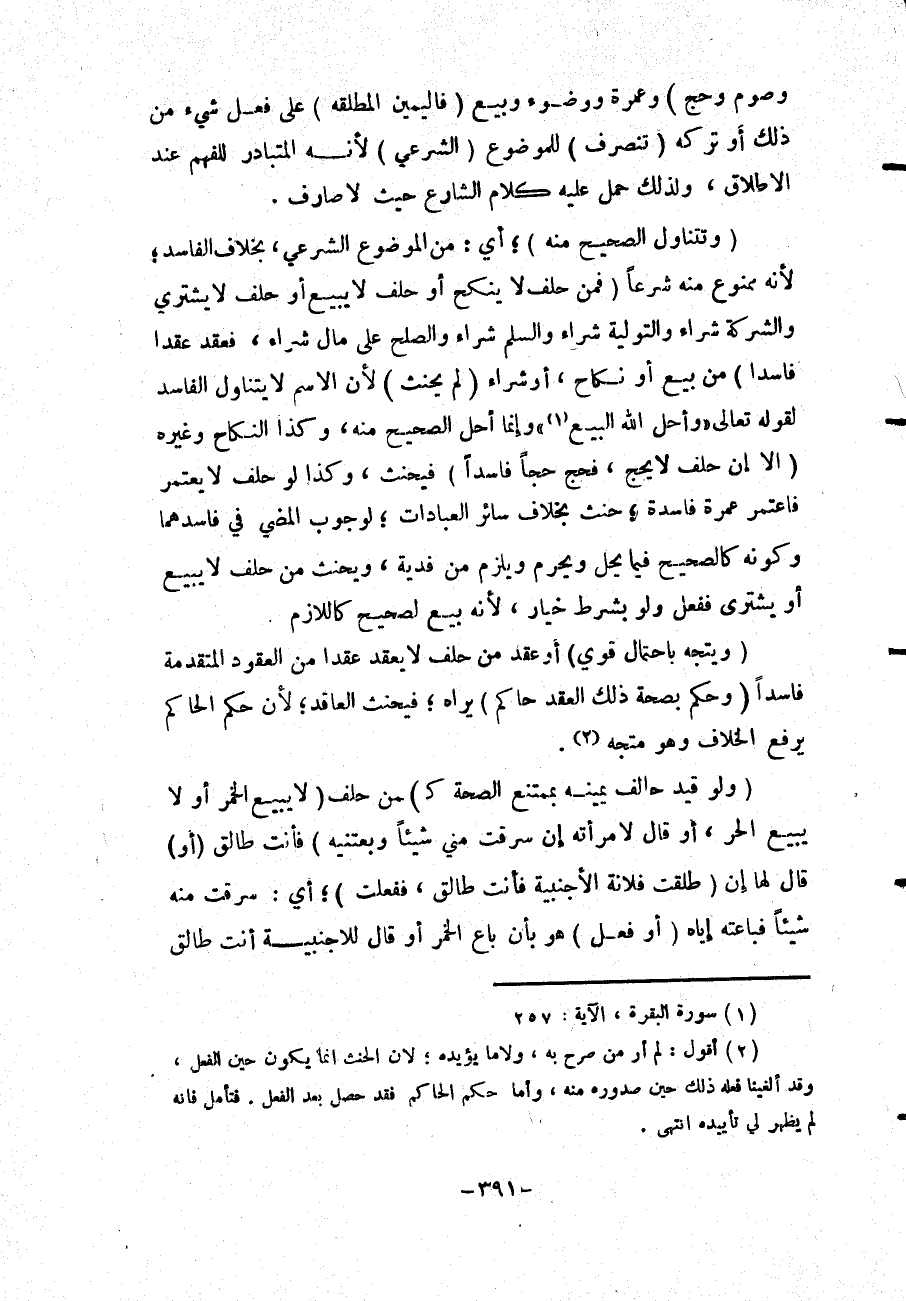 وَصَوْمٍ وَحَجٍّ) وَعُمْرَةٍ وَوُضُوءٍ وَبَيْعٍ (فَالْيَمِينُ الْمُطْلَقَةُ) عَلَى فِعْلِ شَيْءٍ مِنْ ذَلِكَ أَوْ تَرْكِهِ (تَنْصَرِفُ) لِلْمَوْضُوعِ (الشَّرْعِيِّ) ؛ لِأَنَّهُ الْمُتَبَادِرُ لِلْفَهْمِ عِنْدَ الْإِطْلَاقِ، وَلِذَلِكَ حُمِلَ عَلَيْهِ كَلَامُ الشَّارِعِ حَيْثُ لَا صَارِفَ. (وَتَتَنَاوَلُ الصَّحِيحَ مِنْهُ) ، أَيْ: مِنْ الْمَوْضُوعِ الشَّرْعِيِّ، بِخِلَافِ الْفَاسِدِ؛ لِأَنَّهُ مَمْنُوعٌ مِنْهُ شَرْعًا (فَمَنْ حَلَفَ لَا يَنْكِحُ أَوْ حَلَفَ لَا يَبِيعُ أَوْ حَلَفَ لَا يَشْتَرِي وَالشَّرِكَةُ شِرَاءٌ وَالتَّوْلِيَةُ شِرَاءٌ وَالسَّلَمُ شِرَاءٌ وَالصُّلْحُ عَلَى مَالٍ شِرَاءٌ، فَعَقَدَ عَقْدًا فَاسِدًا) مِنْ بَيْعٍ أَوْ نِكَاحٍ، أَوْ شِرَاءٍ (لَمْ يَحْنَثْ) ؛ لِأَنَّ الِاسْمَ لَا يَتَنَاوَلُ الْفَاسِدَ؛ لِقَوْلِهِ تَعَالَى {وَأَحَلَّ اللَّهُ الْبَيْعَ} [البقرة: 275] وَإِنَّمَا أَحَلَّ الصَّحِيحَ مِنْهُ.
