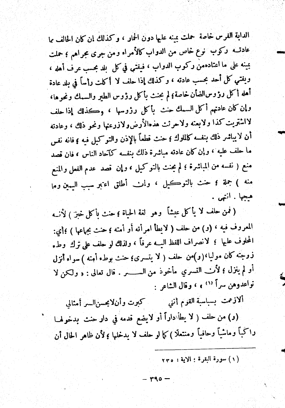 الدَّابَّةِ الْفَرَسُ خَاصَّةً حُمِلَتْ يَمِينُهُ عَلَيْهَا دُونَ الْحِمَارِ، وَكَذَلِكَ إنْ كَانَ الْحَالِفُ مِمَّا عَادَتُهُ رُكُوبُ نَوْعٍ خَاصٍّ مِنْ الدَّوَابِّ كَالْأُمَرَاءِ وَمَنْ جَرَى مَجْرَاهُمْ، حُمِلَتْ يَمِينُهُ عَلَى مَا اعْتَادَهُ مِنْ رُكُوبِ الدَّوَابِّ، فَيُفْتَى فِي كُلِّ بَلَدٍ بِحَسَبِ عُرْفِ أَهْلِهِ، وَيُفْتَى كُلُّ أَحَدٍ بِحَسَبِ عَادَتِهِ.
