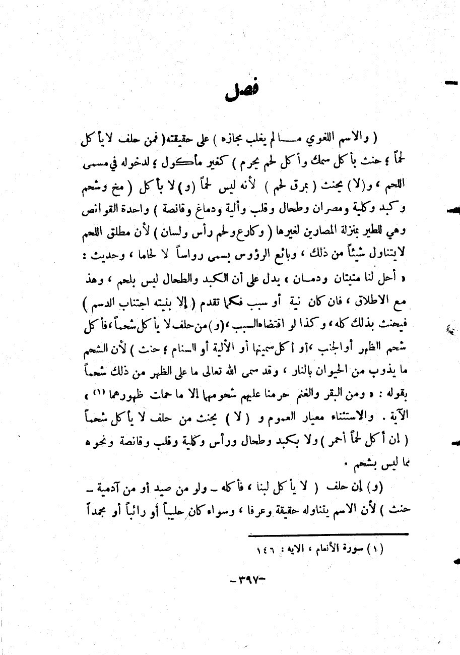 فَصْلٌ (وَالِاسْمُ اللُّغَوِيُّ مَا لَمْ يَغْلِبْ مَجَازُهُ) عَلَى حَقِيقَتِهِ (فَمَنْ حَلَفَ لَا يَأْكُلُ لَحْمًا - حَنِثَ بِأَكْلِ سَمَكٍ وَأَكْلِ لَحْمٍ يَحْرُمُ) كَغَيْرِ مَأْكُولٍ، لِدُخُولِهِ فِي مُسَمَّى اللَّحْمِ، وَ (لَا) يَحْنَثُ (بِمَرَقِ لَحْمٍ) ؛ لِأَنَّهُ لَيْسَ لَحْمًا (وَ) لَا بِأَكْلِ (مُخٍّ وَشَحْمٍ وَكَبِدٍ وَكُلْيَةٍ وَمُصْرَانٍ وَطِحَالٍ وَقَلْبٍ وَأَلْيَةٍ وَدِمَاغٍ وَقَانِصَةٍ) وَاحِدَةُ الْقَوَانِصِ وَهِيَ لِلطَّيْرِ بِمَنْزِلَةِ الْمَصَارِينِ لِغَيْرِهَا (وَكَارِعٍ وَلَحْمِ رَأْسٍ وَلِسَانٍ) ؛ لِأَنَّ مُطْلَقَ اللَّحْمِ لَا يَتَنَاوَلُ شَيْئًا مِنْ ذَلِكَ، وَبَائِعُ الرُّءُوسِ يُسَمَّى رَوَّاسًا لَا لَحَّامًا.