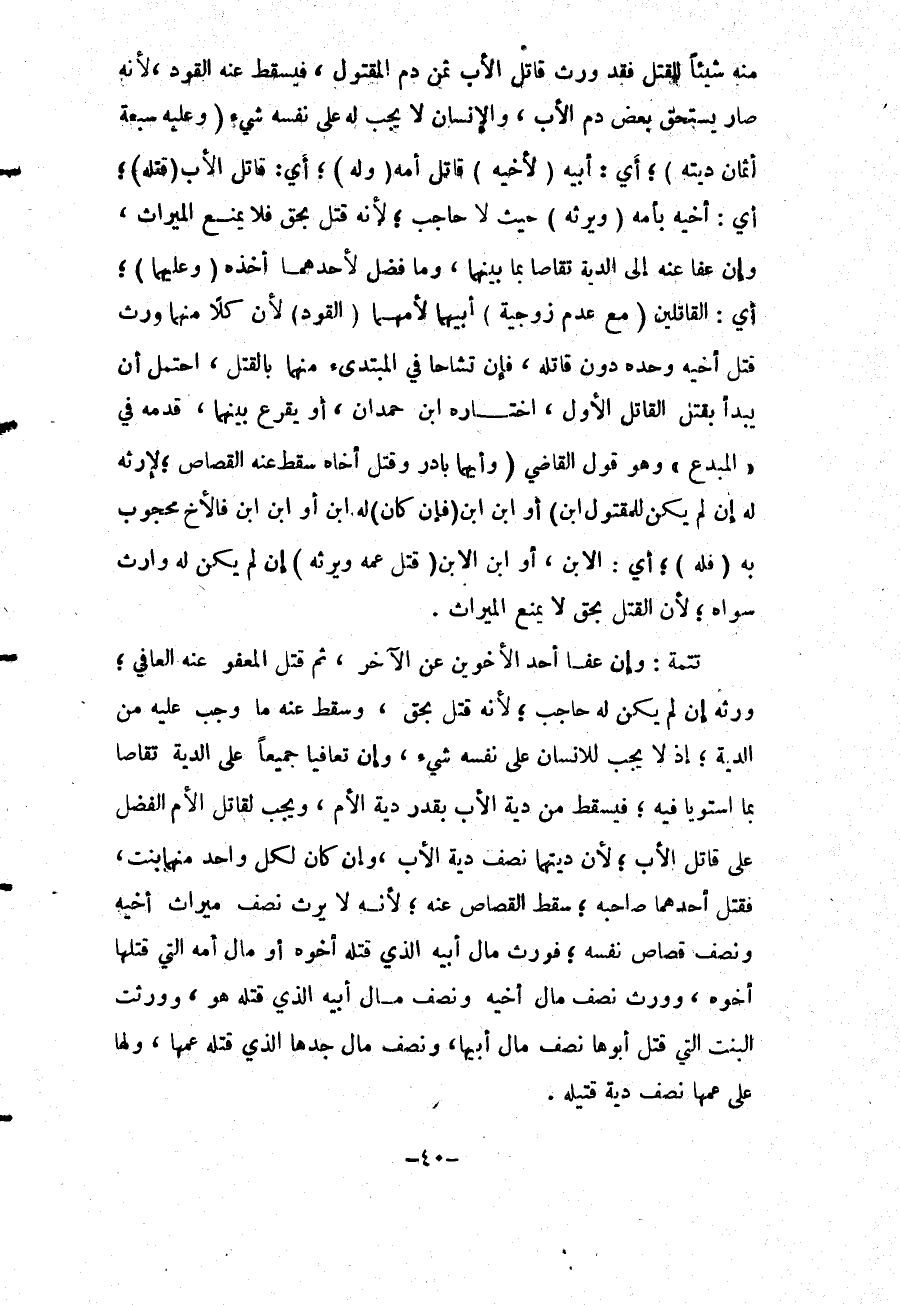 مِنْهُ شَيْئًا لِلْقَتْلِ فَقَدْ وَرِثَ قَاتِلُ الْأَبِ ثَمَنَ دَمِ الْمَقْتُولِ، فَيَسْقُطُ عَنْهُ الْقَوَدُ؛ لِأَنَّهُ صَارَ يَسْتَحِقُّ بَعْضَ دَمِ الْأَبِ، وَالْإِنْسَانُ لَا يَجِبُ لَهُ عَلَى نَفْسِهِ شَيْءٌ (وَعَلَيْهِ سَبْعَةُ أَثْمَانِ دِيَتِهِ) ؛ أَيْ: أَبِيهِ (لِأَخِيهِ) قَاتِلِ أُمِّهِ (وَلَهُ) أَيْ: قَاتِلِ الْأَبِ (قَتْلُهُ) أَيْ: أَخِيهِ بِأُمِّهِ (وَيَرِثُهُ) حَيْثُ لَا حَاجِبَ؛ لِأَنَّهُ قَتْلٌ بِحَقٍّ فَلَا يَمْنَعُ الْمِيرَاثَ، وَإِنْ عَفَا عَنْهُ إلَى الدِّيَةِ تَقَاصَّا بِمَا بَيْنَهُمَا، وَمَا فَضَلَ لِأَحَدِهِمَا أَخَذَهُ (وَعَلَيْهِمَا) أَيْ: الْقَاتِلَيْنِ (مَعَ عَدَمِ زَوْجِيَّةِ) أَبِيهِمَا لِأُمِّهِمَا (الْقَوَدُ) لِأَنَّ كُلًّا مِنْهُمَا وَرِثَ قَتْلَ أَخِيهِ وَحْدَهُ دُونَ قَاتِلِهِ، فَإِنْ تَشَاحَّا فِي الْمُبْتَدِئِ مِنْهُمَا بِالْقَتْلِ، احْتَمَلَ أَنْ يُبْدَأَ بِقَتْلِ الْقَاتِلِ الْأَوَّلِ، اخْتَارَهُ ابْنُ حَمْدَانَ، أَوْ يُقْرَعَ بَيْنَهُمَا، قَدَّمَهُ فِي " الْمُبْدِعِ " وَهُوَ قَوْلُ الْقَاضِي (وَأْيُهُمَا بَادَرَ وَقَتَلَ أَخَاهُ سَقَطَ عَنْهُ الْقِصَاصُ؛ لِإِرْثِهِ لَهُ إنْ لَمْ يَكُنْ لِلْمَقْتُولِ ابْنٌ) أَوْ ابْنُ ابْنٍ (فَإِنْ كَانَ) لَهُ ابْنٌ أَوْ ابْنُ ابْنٍ فَالْأَخُ مَحْجُوبٌ بِهِ (فَلَهُ) أَيْ: الِابْنِ أَوْ ابْنِ الِابْنِ (قَتْلُ عَمِّهِ، وَيَرِثُهُ) إنْ لَمْ يَكُنْ لَهُ وَارِثٌ سِوَاهُ؛ لِأَنَّ الْقَتْلَ بِحَقٍّ لَا يَمْنَعُ الْمِيرَاثَ.