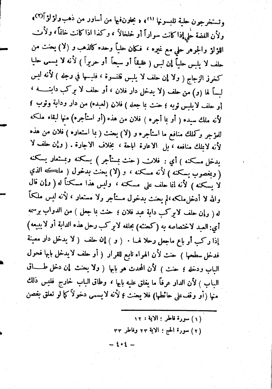 {وَمِنْ كُلٍّ تَأْكُلُونَ لَحْمًا طَرِيًّا وَتَسْتَخْرِجُونَ حِلْيَةً تَلْبَسُونَهَا} [فاطر: 12] {يُحَلَّوْنَ فِيهَا مِنْ أَسَاوِرَ مِنْ ذَهَبٍ وَلُؤْلُؤًا} [الحج: 23] وَلِأَنَّ الْفِضَّةَ حُلِيٌّ إذَا كَانَتْ سِوَارًا أَوْ خَلْخَالًا، وَكَذَا إذَا كَانَتْ خَاتَمًا، وَلِأَنَّ اللُّؤْلُؤَ وَالْجَوْهَرَ حُلِيٌّ مَعَ غَيْرِهِ، فَكَانَ حُلِيًّا وَحْدَهُ كَالذَّهَبِ وَ (لَا) يَحْنَثُ مَنْ حَلَفَ لَا يَلْبَسُ حُلِيًّا إنْ لَبِسَ (عَقِيقًا أَوْ سَيْحًا أَوْ حَرِيرًا) ؛ لِأَنَّهُ لَا يُسَمَّى حُلِيًّا كَخَرَزِ الزُّجَاجِ (وَلَا إنْ حَلَفَ لَا يَلْبَسُ قَلَنْسُوَةً، فَلَبِسَهَا فِي رِجْلِهِ) ؛ لِأَنَّهُ لَيْسَ لِبْسًا لَهَا.