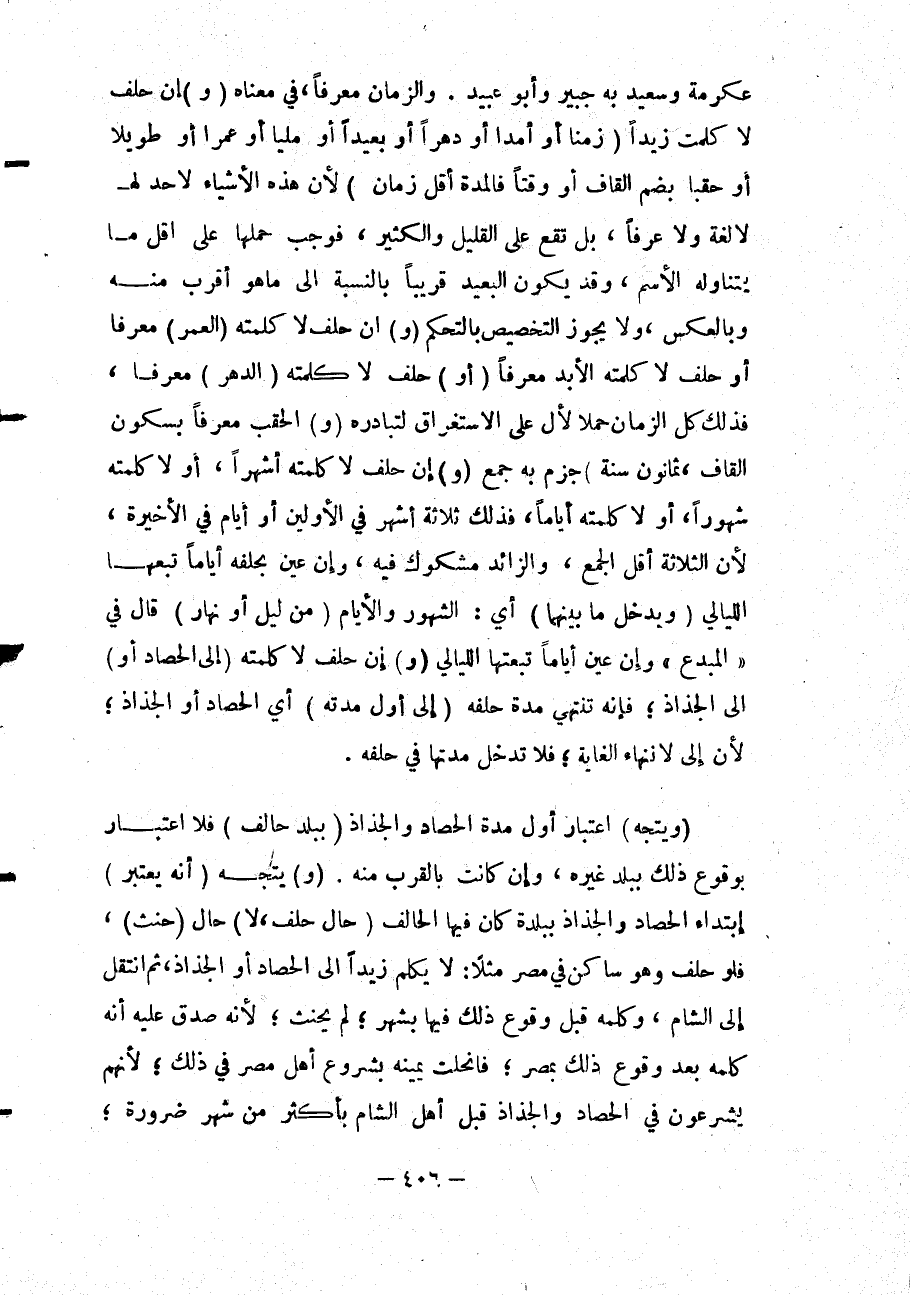 عِكْرِمَةُ وَسَعِيدُ بْنُ جُبَيْرٍ وَأَبُو عُبَيْدٍ وَالزَّمَانُ مُعَرَّفًا، فِي مَعْنَاهُ (وَ) إنْ حَلَفَ لَا كَلَّمْت زَيْدًا (زَمَنًا أَوْ أَمَدًا أَوْ دَهْرًا أَوْ بَعِيدًا أَوْ مَلِيًّا أَوْ عُمْرًا أَوْ طَوِيلًا أَوْ حُقُبًا بِضَمِّ الْقَافِ أَوْ وَقْتًا فَالْمُدَّةُ أَقَلُّ زَمَانٍ) ؛ لِأَنَّ هَذِهِ الْأَشْيَاءَ لَا حَدَّ لَهَا لَا لُغَةً وَلَا عُرْفًا، بَلْ تَقَعُ عَلَى الْقَلِيلِ وَالْكَثِيرِ، فَوَجَبَ حَمْلُهَا عَلَى أَقَلَّ مَا يَتَنَاوَلُهُ الِاسْمُ، وَقَدْ يَكُونُ الْبَعِيدُ قَرِيبًا بِالنِّسْبَةِ إلَى مَا هُوَ أَقْرَبُ مِنْهُ وَبِالْعَكْسِ، وَلَا يَجُوزُ التَّخْصِيصُ بِالتَّحَكُّمِ.