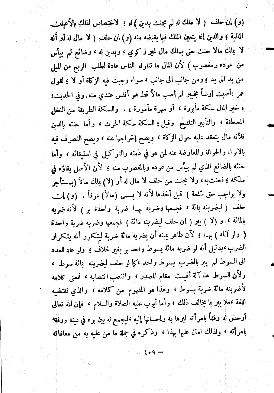 (وَ) إنْ حَلَفَ (لَا مَالَ لَهُ أَوْ أَنَّهُ لَا يَمْلِكُ مَالًا حَنِثَ حَتَّى بِمِلْكِ مَالٍ غَيْرِ زَكَوِيٍّ، وَبِدَيْنٍ لَهُ، وَضَائِعٍ لَمْ يَيْأَسْ مِنْ عَوْدِهِ وَمَغْصُوبٍ) ؛ لِأَنَّ الْمَالَ مَا تَنَاوَلَهُ النَّاسُ عَادَةً لِطَلَبِ الرِّبْحِ مِنْ الْمَيْلِ مِنْ يَدٍ إلَى يَدٍ، وَمِنْ جَانِبٍ إلَى جَانِبٍ، سَوَاءٌ وَجَبَتْ فِيهِ الزَّكَاةُ أَوْ لَا لِقَوْلِ عُمَرَ: أَصَبْتُ أَرْضًا بِخَيْبَرَ لَمْ أُصِبْ مَالًا قَطُّ هُوَ أَنْفَسُ عِنْدِي مِنْهُ. وَفِي الْحَدِيثِ: «خَيْرُ الْمَالِ سِكَّةٌ مَأْبُورَةٌ، أَوْ مُهْرَةٌ مَأْمُورَةٌ» . وَالسِّكَّةُ الطَّرِيقَةُ مِنْ النَّخْلِ الْمُصْطَفَّةُ، وَالتَّأْبِيرُ التَّلْقِيحُ وَقِيلَ: السِّكَّةُ سِكَّةُ الْحَرْثِ.