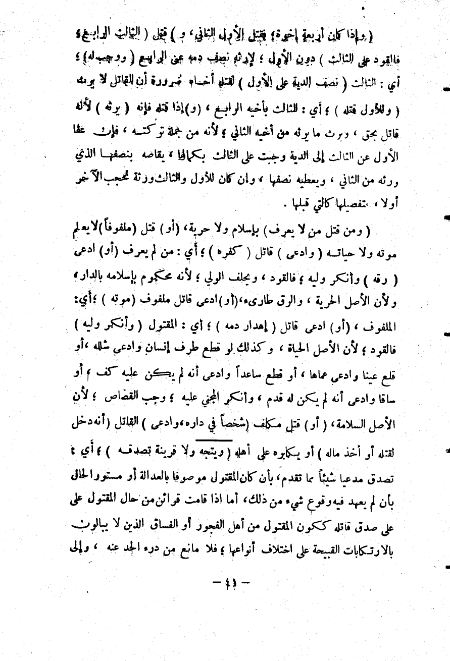(وَإِذَا كَانَ أَرْبَعَةُ إخْوَةٍ، فَقَتَلَ الْأَوَّلُ الثَّانِيَ وَ) قَتَلَ (الثَّالِثُ الرَّابِعَ، فَالْقَوَدُ عَلَى الثَّالِثِ) دُونَ الْأَوَّلِ؛ لِإِرْثِهِ نِصْفَ دَمِهِ عَنْ الرَّابِعِ (وَوَجَبَ لَهُ) أَيْ: الثَّالِثِ (نِصْفُ الدِّيَةِ عَلَى الْأَوَّلِ) لِقَتْلِهِ أَخَاهُ ضَرُورَةَ أَنَّ الْقَاتِلَ لَا يَرِثُ (وَلِلْأَوَّلِ قَتْلُهُ) أَيْ: الثَّالِثِ بِأَخِيهِ الرَّابِعِ (وَ) إذَا قَتَلَهُ فَإِنَّهُ (يَرِثُهُ) ؛ لِأَنَّهُ قَاتِلٌ بِحَقٍّ وَيَرِثُ مَا يَرِثُهُ مِنْ أَخِيهِ الثَّانِي؛ لِأَنَّهُ مِنْ جُمْلَةِ تَرِكَتِهِ، فَإِنْ عَفَا الْأَوَّلُ عَنْ الثَّالِثِ إلَى الدِّيَةِ، وَجَبَتْ عَلَى الثَّالِثِ بِكَمَالِهَا؛ يُقَاصُّهُ بِنِصْفِهَا الَّذِي وَرِثَهُ مِنْ الثَّانِي، وَيُعْطِيهِ نِصْفَهَا، وَإِنْ كَانَ لِلْأَوَّلِ وَالثَّالِثِ وَرَثَةٌ تَحْجُبُ الْآخَرَ أَوْ لَا بِتَفْصِيلِهَا كَاَلَّتِي قَبْلَهَا.