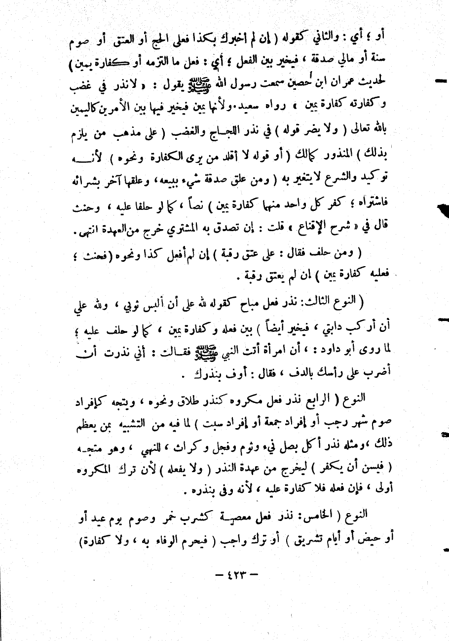 (النَّوْعُ الثَّالِثُ: نَذْرُ فِعْلٍ مُبَاحٍ كَقَوْلِهِ: لِلَّهِ عَلَيَّ أَنْ أَلْبَسَ ثَوْبِي، وَلِلَّهِ عَلَيَّ أَنْ أَرْكَبَ دَابَّتِي، فَيُخَيَّرُ أَيْضًا) بَيْنَ فِعْلِهِ وَكَفَّارَةِ يَمِينٍ، كَمَا لَوْ حَلَفَ عَلَيْهِ، لِمَا رَوَى أَبُو دَاوُد: «أَنَّ امْرَأَةً أَتَتْ النَّبِيَّ - صَلَّى اللَّهُ عَلَيْهِ وَسَلَّمَ - فَقَالَتْ: إنِّي نَذَرْتُ أَنْ أَضْرِبَ عَلَى رَأْسِكَ بِالدُّفِّ، فَقَالَ: أَوْفِ بِنَذْرِكَ» .