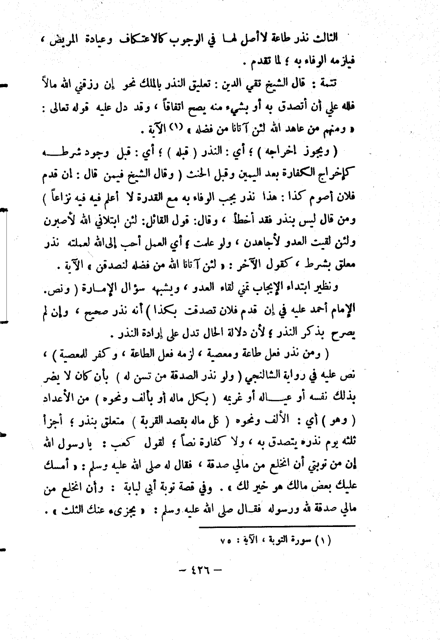 تَتِمَّةٌ: قَالَ الشَّيْخُ تَقِيُّ الدِّينِ: تَعْلِيقُ النَّذْرِ بِالْمِلْكِ نَحْوُ إنْ رَزَقَنِي اللَّهُ مَالًا فَلِلَّهِ عَلَيَّ أَنْ أَتَصَدَّقَ بِهِ أَوْ بِشَيْءٍ مِنْهُ يَصِحُّ اتِّفَاقًا، وَقَدْ دَلَّ عَلَيْهِ قَوْله تَعَالَى: {وَمِنْهُمْ مَنْ عَاهَدَ اللَّهَ لَئِنْ آتَانَا مِنْ فَضْلِهِ} [التوبة: 75] الْآيَةَ.