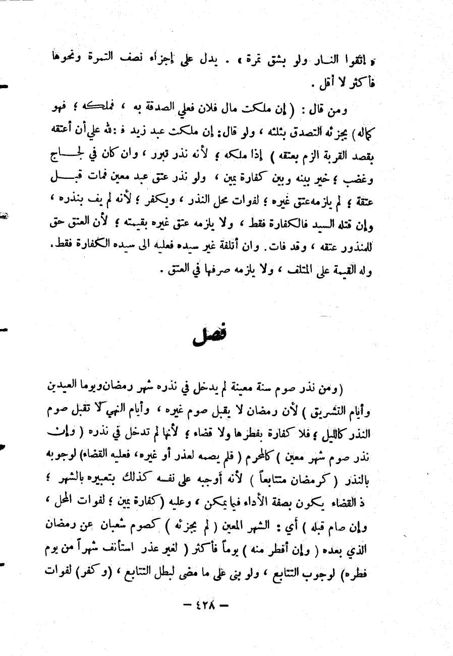 فَصْلٌ (وَمَنْ نَذَرَ صَوْمَ سَنَةٍ مُعَيَّنَةٍ لَمْ يَدْخُلْ فِي نَذْرِهِ شَهْرُ رَمَضَانَ وَيَوْمَا الْعِيدَيْنِ وَأَيَّامُ التَّشْرِيقِ) لِأَنَّ رَمَضَانَ لَا يَقْبَلُ صَوْمَ غَيْرِهِ، وَأَيَّامُ النَّهْيِ لَا تَقْبَلُ صَوْمَ النَّذْرِ كَاللَّيْلِ؛ فَلَا كَفَّارَةَ بِفِطْرِهَا وَلَا قَضَاءَ؛ لِأَنَّهَا لَمْ تَدْخُلْ فِي نَذْرِهِ (وَإِنْ نَذَرَ صَوْمَ شَهْرٍ مُعَيَّنٍ) كَالْمُحَرَّمِ (فَلَمْ يَصُمْهُ لِعُذْرٍ أَوْ غَيْرِهِ، فَعَلَيْهِ الْقَضَاءُ) لِوُجُوبِهِ بِالنَّذْرِ (كَرَمَضَانَ مُتَتَابِعًا) لِأَنَّهُ أَوْجَبَهُ عَلَى نَفْسِهِ كَذَلِكَ بِتَعْبِيرِهِ بِالشَّهْرِ؛ إذْ الْقَضَاءُ يَكُونُ بِصِفَةِ الْأَدَاءِ فِيمَا يُمْكِنُ، وَعَلَيْهِ (كَفَّارَةُ يَمِينٍ؛ لِفَوَاتِ الْمَحَلِّ، وَإِنْ صَامَ قَبْلَهُ) أَيْ: الشَّهْرَ الْمُعَيَّنَ (لَمْ يُجْزِئْهُ) كَصَوْمِ شَعْبَانَ عَنْ رَمَضَانَ الَّذِي بَعْدَهُ (وَإِنْ أَفْطَرَ مِنْهُ) يَوْمًا فَأَكْثَرَ (لِغَيْرِ عُذْرٍ اسْتَأْنَفَ شَهْرًا مِنْ يَوْمِ فِطْرِهِ) لِوُجُوبِ التَّتَابُعِ، وَلَوْ بَنَى عَلَى مَا مَضَى لَبَطَلَ التَّتَابُعُ، (وَكَفَّرَ) لِفَوَاتِ