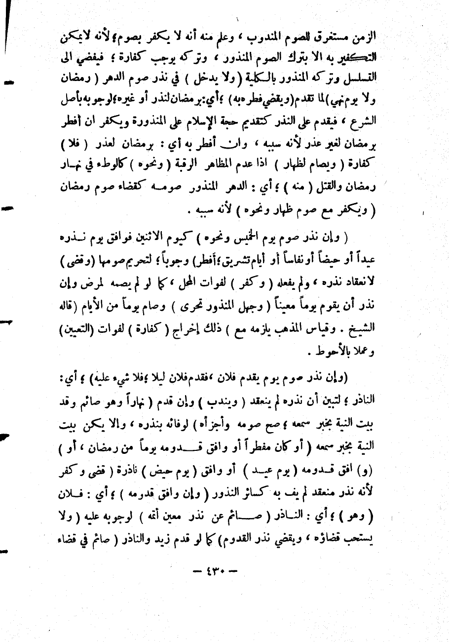 (وَإِنْ نَذَرَ صَوْمَ يَوْمِ الْخَمِيسِ وَنَحْوِهِ) كَيَوْمِ الِاثْنَيْنِ فَوَافَقَ يَوْمُ نَذْرِهِ عِيدًا أَوْ حَيْضًا أَوْ نِفَاسًا أَوْ أَيَّامَ تَشْرِيقٍ؛ أَفْطَرَ وُجُوبًا؛ لِتَحْرِيمِ صَوْمِهَا (وَقَضَى) لِانْعِقَادِ نَذْرِهِ، وَلَمْ يَفْعَلْهُ (وَكَفَّرَ) لِفَوَاتِ الْمَحَلِّ، كَمَا لَوْ لَمْ يَصُمْهُ لِمَرَضٍ.