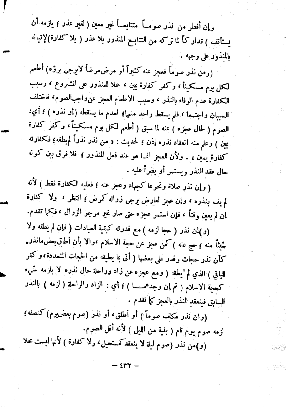 (وَإِنْ نَذَرَ صَلَاةً وَنَحْوَهَا كَجِهَادٍ وَعَجَزَ عَنْهُ؛ فَعَلَيْهِ الْكَفَّارَةُ فَقَطْ) لِأَنَّهُ لَمْ يَفِ بِنَذْرِهِ، وَإِنْ عَجَزَ لِعَارِضٍ يُرْجَى زَوَالُهُ كَمَرَضٍ؛ انْتَظَرَ، وَلَا كَفَّارَةٌ إنْ لَمْ يُعَيِّنْ وَقْتًا، فَإِنْ اسْتَمَرَّ عَجْزُهُ حَتَّى صَارَ غَيْرَ مَرْجُوِّ الزَّوَالِ، فَكَمَا تَقَدَّمَ.