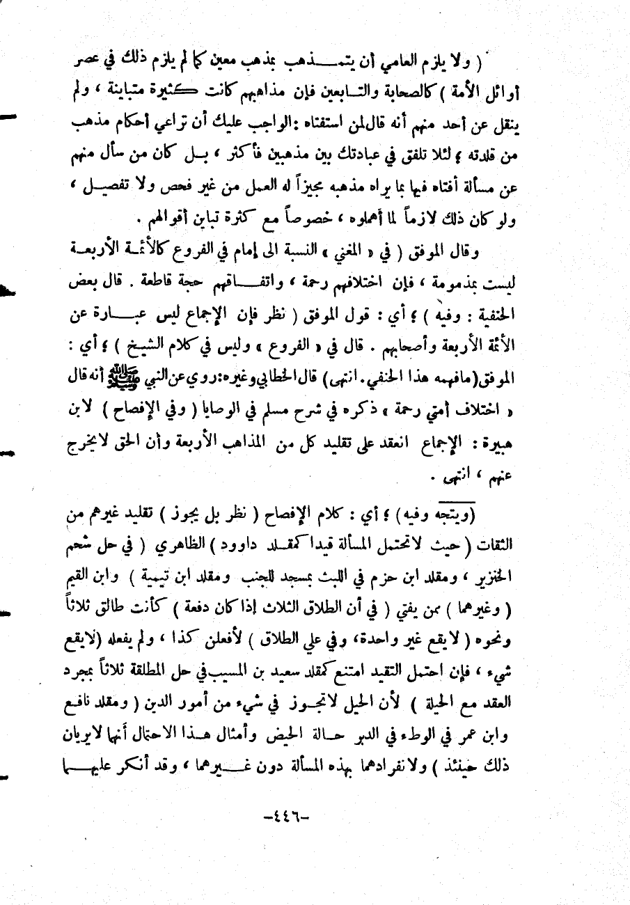 وَقَالَ الْمُوَفَّقُ (فِي " الْمُغْنِي " النِّسْبَةُ إلَى إمَامٍ فِي الْفُرُوعِ كَالْأَئِمَّةِ الْأَرْبَعَةِ لَيْسَتْ بِمَذْمُومَةٍ، فَإِنَّ اخْتِلَافَهُمْ رَحْمَةٌ، وَاتِّفَاقَهُمْ حُجَّةٌ قَاطِعَةٌ. قَالَ بَعْضُ الْحَنَفِيَّةِ: وَفِيهِ)