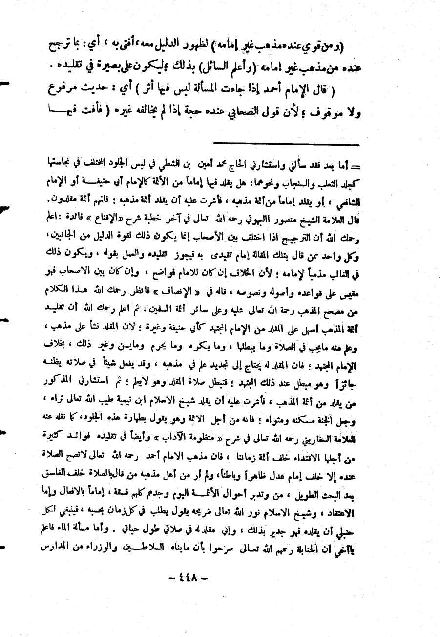 (وَمَنْ قَوِيَ عِنْدَهُ مَذْهَبُ غَيْرِ إمَامِهِ) لِظُهُورِ الدَّلِيلِ مَعَهُ، أَفْتَى بِهِ، أَيْ: بِمَا تَرَجَّحَ عِنْدَهُ مِنْ مَذْهَبِ غَيْرِ إمَامِهِ (وَأَعْلَمَ السَّائِلَ) بِذَلِكَ؛ لِيَكُونَ عَلَى بَصِيرَةٍ فِي تَقْلِيدِهِ.