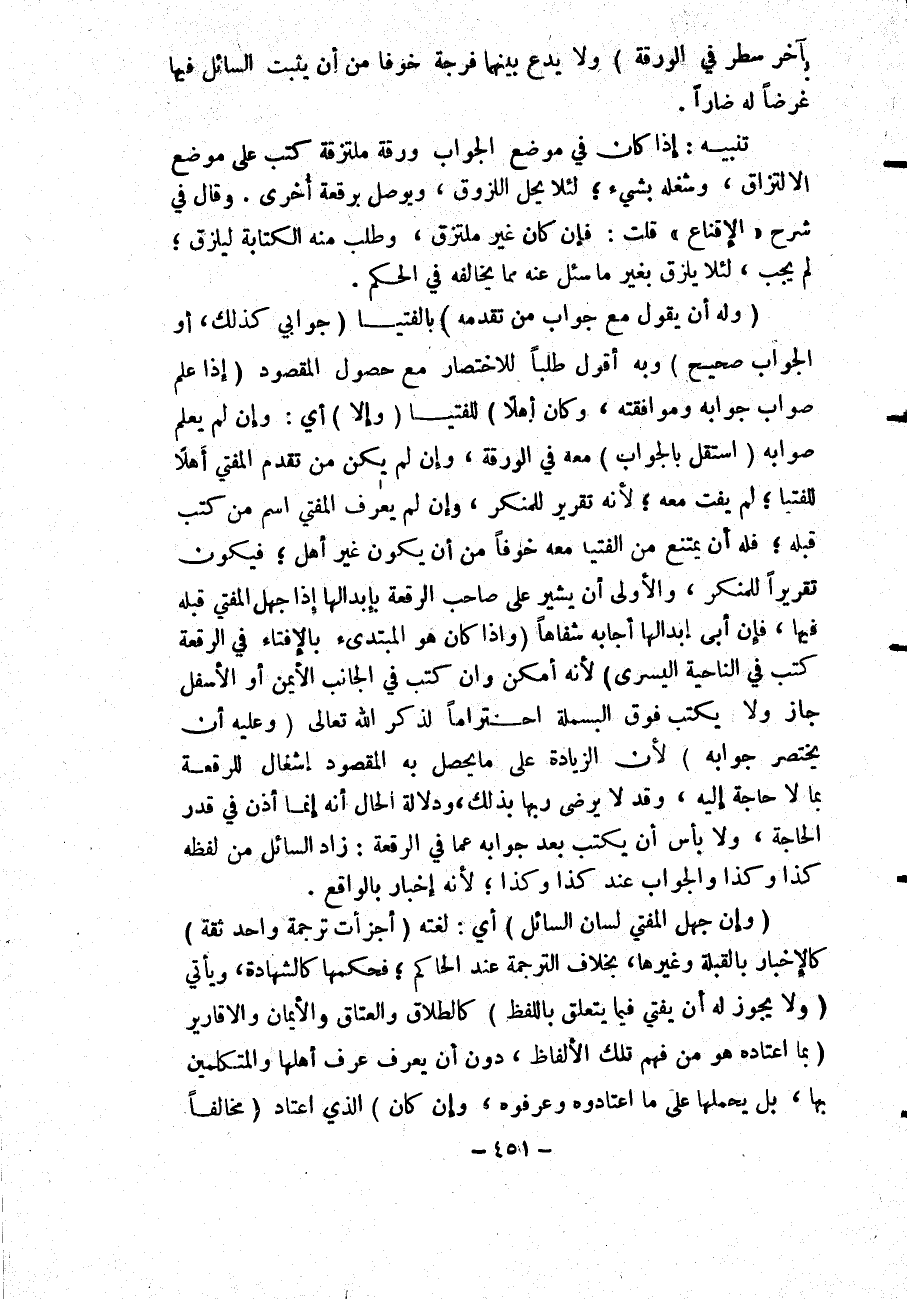 بِآخِرِ سَطْرٍ فِي الْوَرَقَةِ) وَلَا يَدَعُ بَيْنَهُمَا فُرْجَةً خَوْفًا مِنْ أَنْ يُثْبِتَ السَّائِلُ فِيهَا غَرَضًا لَهُ ضَارًّا.