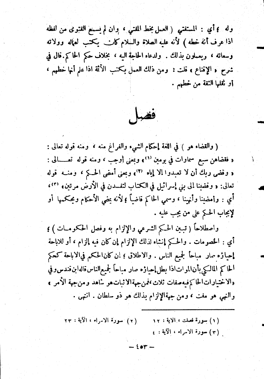 فَصْلٌ (وَالْقَضَاءُ هُوَ) فِي اللُّغَةِ إحْكَامُ الشَّيْءِ وَالْفَرَاغُ مِنْهُ، وَمِنْهُ قَوْله تَعَالَى: {فَقَضَاهُنَّ سَبْعَ سَمَاوَاتٍ فِي يَوْمَيْنِ} [فصلت: 12] وَبِمَعْنَى أَوْجَبَ، وَمِنْهُ قَوْله تَعَالَى: {وَقَضَى رَبُّكَ أَلا تَعْبُدُوا إِلا إِيَّاهُ} [الإسراء: 23] وَبِمَعْنَى أَمْضَى الْحُكْمَ، وَمِنْهُ قَوْله تَعَالَى: " {وَقَضَيْنَا إِلَى بَنِي إِسْرَائِيلَ فِي الْكِتَابِ لَتُفْسِدُنَّ فِي الأَرْضِ مَرَّتَيْنِ} [الإسراء: 4] ، أَيْ: وَأَمْضَيْنَا وَأَنْهَيْنَا، وَسُمِّيَ الْحَاكِمُ قَاضِيًا، لِأَنَّهُ يُمْضِي الْأَحْكَامَ وَيُحْكِمُهَا أَوْ لِإِيجَابِ الْحُكْمِ عَلَى مَنْ يَجِبُ عَلَيْهِ. وَاصْطِلَاحًا: (تَبَيُّنُ الْحُكْمِ الشَّرْعِيِّ وَالْإِلْزَامُ بِهِ وَفَصْلُ الْحُكُومَاتِ) ؛ أَيْ: الْخُصُومَاتِ. وَالْحُكْمُ إنْشَاءٌ لِذَلِكَ الْإِلْزَامِ إنْ كَانَ فِيهِ إلْزَامٌ، أَوْ لِلْإِبَاحَةِ إحْيَاؤُهُ صَارَ مُبَاحًا لِجَمِيعِ النَّاسِ. وَالْإِطْلَاقُ، إنْ كَانَ الْحُكْمُ فِي الْإِبَاحَةِ كَحُكْمِ الْحَاكِمِ الْمَالِكِيِّ بِأَنَّ الْمَوَاتَ إذَا بَطَلَ إحْيَاؤُهُ صَارَ مُبَاحًا لِجَمِيعِ النَّاسِ قَالَهُ ابْنُ قُنْدُسٍ وَفِي " الِاخْتِيَارَاتِ الْحَاكِمُ فِيهِ صِفَاتٌ ثَلَاثٌ، فَمِنْ جِهَةِ الْإِثْبَاتِ هُوَ شَاهِدٌ وَمِنْ جِهَةِ الْأَمْرِ " وَالنَّهْيِ هُوَ مُفْتٍ، وَمِنْ جِهَةِ الْإِلْزَامِ بِذَلِكَ هُوَ ذُو سُلْطَانٍ. انْتَهَى.