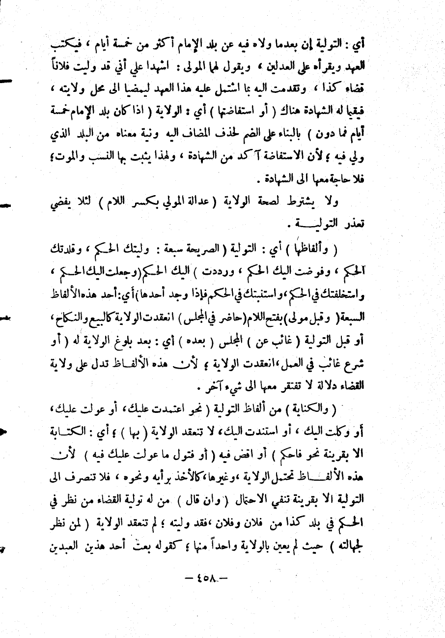(وَأَلْفَاظُهَا) أَيْ: التَّوْلِيَةِ (الصَّرِيحَةُ سَبْعَةٌ: وَلَّيْتُكَ الْحُكْمَ، وَقَلَّدْتُكَ الْحُكْمَ، وَفَوَّضْتُ إلَيْكَ الْحُكْمَ، وَرَدَدْتُ) إلَيْكَ الْحُكْمَ (وَجَعَلْتُ إلَيْكَ الْحُكْمَ، وَاسْتَخْلَفْتُكَ فِي الْحُكْمِ، وَاسْتَنَبْتُك فِي الْحُكْمِ فَإِذَا وُجِدَ أَحَدُهَا) أَيْ: أَحَدُ هَذِهِ الْأَلْفَاظِ السَّبْعَةِ (وَقَبِلَ مُوَلَّى) بِفَتْحِ اللَّامِ (حَاضِرٌ فِي الْمَجْلِسِ) انْعَقَدَتْ الْوِلَايَةُ كَالْبَيْعِ وَالنِّكَاحِ، أَوْ قَبِلَ التَّوْلِيَةَ (غَائِبٌ عَنْ) الْمَجْلِسِ (بَعْدَهُ) أَيْ: بَعْدَ بُلُوغِ الْوِلَايَةِ لَهُ (أَوْ شَرَعَ غَائِبٌ فِي الْعَمَلِ، انْعَقَدَتْ الْوِلَايَةُ) ؛ لِأَنَّ هَذِهِ الْأَلْفَاظَ تَدُلُّ عَلَى وِلَايَةِ الْقَضَاءِ دَلَالَةً لَا تَفْتَقِرُ مَعَهَا إلَى شَيْءٍ آخَرَ.