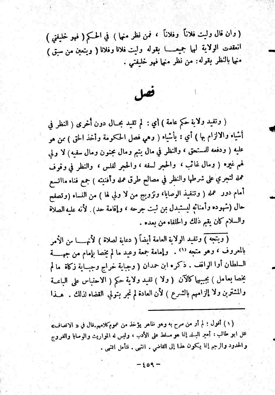 فَصْلٌ (وَتُفِيدُ وِلَايَةُ حُكْمٍ عَامَّةٍ) أَيْ: لَمْ تُقَيَّدْ بِحَالٍ دُونَ أُخْرَى (النَّظَرَ فِي أَشْيَاءَ وَالْإِلْزَامَ بِهَا) أَيْ: بِأَشْيَاءَ (وَهِيَ فَصْلُ الْحُكُومَةِ وَأَخْذُ الْحَقِّ) مِمَّنْ هُوَ عَلَيْهِ (وَدَفْعُهُ لِلْمُسْتَحِقِّ، وَالنَّظَرَ فِي مَالِ يَتِيمٍ وَمَالِ مَجْنُونٍ وَمَالِ سَفِيهٍ) لَا وَلِيَّ لَهُمْ غَيْرُهُ (وَمَالِ غَائِبٍ، وَالْحَجْرُ لِسَفَهٍ، وَالْحَجْرُ لِفَلَسٍ، وَالنَّظَرَ فِي وُقُوفِ عَمَلِهِ لِتَجْرِيَ عَلَى شَرْطِهَا، وَالنَّظَرَ فِي مَصَالِحِ طُرُقِ عَمَلِهِ وَأَفْنِيَتِهِ) جَمْعُ فِنَاءٍ مَا اتَّسَعَ أَمَامَ دُورِ عَمَلِهِ (وَتَنْفِيذَ الْوَصَايَا، وَتَزْوِيجَ مَنْ لَا وَلِيَّ لَهَا) مِنْ النِّسَاءِ (وَتَصَفُّحَ حَالِ شُهُودِهِ وَأُمَنَائِهِ لِيَسْتَبْدِلَ بِمَنْ ثَبَتَ جُرْحُهُ، وَإِقَامَةِ حَدٍّ) «لِأَنَّهُ - عَلَيْهِ الصَّلَاةُ وَالسَّلَامُ - كَانَ يُقِيمُ ذَلِكَ» وَالْخُلَفَاءُ مِنْ بَعْدِهِ.