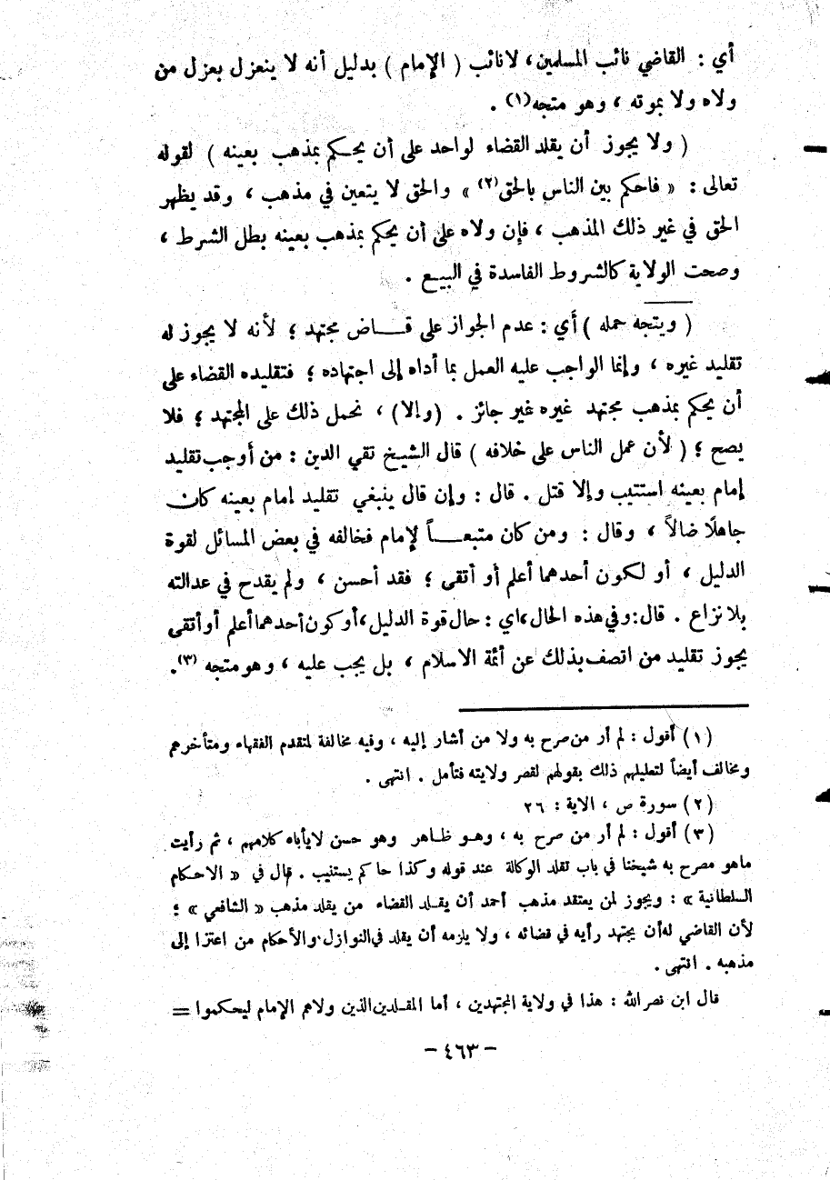 أَيْ: الْقَاضِي نَائِبُ الْمُسْلِمِينَ لَا نَائِبُ (الْإِمَامِ) بِدَلِيلِ أَنَّهُ لَا يَنْعَزِلُ بِعَزْلِ مَنْ وَلَّاهُ وَلَا بِمَوْتِهِ، وَهُوَ مُتَّجِهٌ.