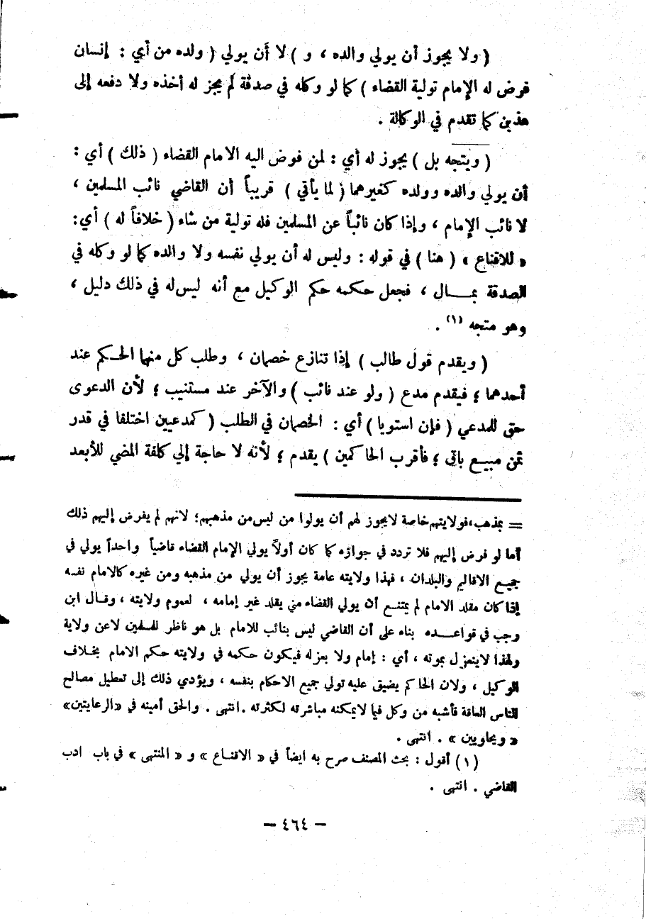 (وَيَتَّجِهُ بَلْ) يَجُوزُ لَهُ أَيْ: لِمَنْ فَوَّضَ إلَيْهِ الْإِمَامُ الْقَضَاءَ (ذَلِكَ) أَيْ: أَنْ يُوَلِّيَ وَالِدَهُ وَوَلَدَهُ كَغَيْرِهِمَا (لِمَا يَأْتِي) قَرِيبًا أَنَّ الْقَاضِيَ نَائِبُ الْمُسْلِمِينَ، لَا نَائِبُ الْإِمَامِ، وَإِذَا كَانَ نَائِبًا عَنْ الْمُسْلِمِينَ فَلَهُ تَوْلِيَةُ مَنْ شَاءَ (خِلَافًا لَهُ) أَيْ: " لِلْإِقْنَاعِ " (هُنَا) فِي قَوْلِهِ: وَلَيْسَ لَهُ أَنْ يُوَلِّيَ نَفْسَهُ وَلَا وَالِدَهُ كَمَا لَوْ وَكَّلَهُ فِي الصَّدَقَةِ بِمَالٍ، فَجَعَلَ حُكْمَهُ حُكْمَ الْوَكِيلِ مَعَ أَنَّهُ لَيْسَ لَهُ فِي ذَلِكَ دَلِيلٌ، وَهُوَ مُتَّجِهٌ.