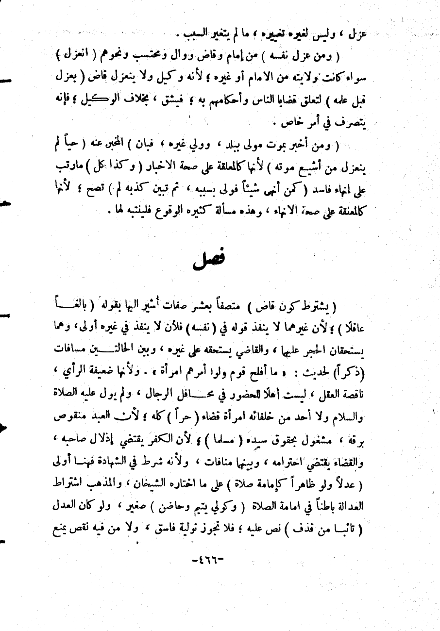 فَصْلٌ (يُشْتَرَطُ كَوْنُ قَاضٍ) مُتَّصِفًا بِعَشْرِ صِفَاتٍ أُشِيرَ إلَيْهَا بِقَوْلِهِ (بَالِغًا عَاقِلًا) ؛ لِأَنَّ غَيْرَهُمَا لَا يَنْفُذُ قَوْلُهُ فِي (نَفْسِهِ) فَلَأَنْ لَا يَنْفُذَ فِي غَيْرِهِ أَوْلَى، وَهُمَا يَسْتَحِقَّانِ الْحَجْرَ عَلَيْهِمَا، وَالْقَاضِي يَسْتَحِقُّهُ عَلَى غَيْرِهِ، وَبَيْنَ الْحَالَتَيْنِ مَسَافَاتٌ (ذِكْرًا) لِحَدِيثِ: «مَا أَفْلَحَ قَوْمٌ وَلَّوْا أَمْرَهُمْ امْرَأَةً» .