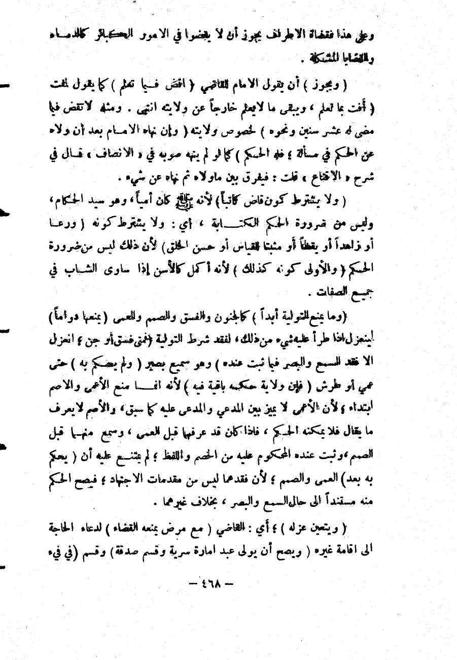 وَعَلَى هَذَا فَقُضَاةُ الْأَطْرَافِ يَجُوزُ أَنْ لَا يَقْضُوا فِي الْأُمُورِ الْكَبَائِرِ كَالدِّمَاءِ وَالْقَضَايَا الْمُشْكِلَةِ.