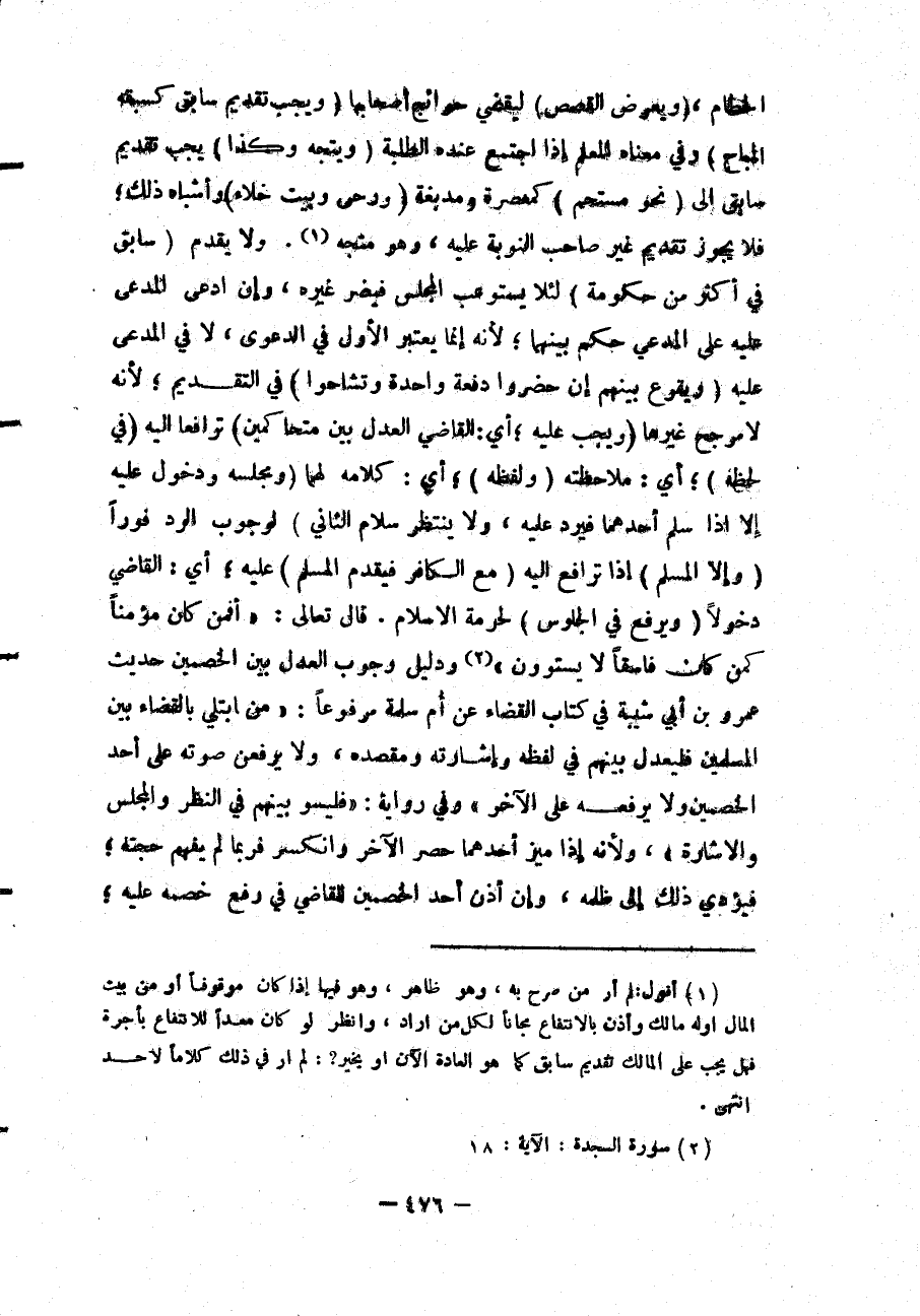 (وَيَجِبُ عَلَيْهِ أَيْ: الْقَاضِي الْعَدْلُ بَيْنَ مُتَحَاكِمَيْنِ) تَرَافَعَا إلَيْهِ (فِي لَحْظِهِ) أَيْ: مُلَاحَظَتِهِ (وَلَفْظِهِ) أَيْ: كَلَامِهِ لَهُمَا (وَمَجْلِسِهِ وَدُخُولٍ عَلَيْهِ إلَّا إذَا سَلَّمَ أَحَدُهُمَا فَيَرُدُّ عَلَيْهِ، وَلَا يَنْتَظِرُ سَلَامَ الثَّانِي) لِوُجُوبِ الرَّدِّ فَوْرًا (وَإِلَّا الْمُسْلِمَ) إذَا تَرَافَعَ إلَيْهِ (مَعَ الْكَافِرِ فَيُقَدِّمُ الْمُسْلِمَ) عَلَيْهِ أَيْ: الْقَاضِي دُخُولًا (وَيَرْفَعُ فِي الْجُلُوسِ) لِحُرْمَةِ الْإِسْلَامِ.
