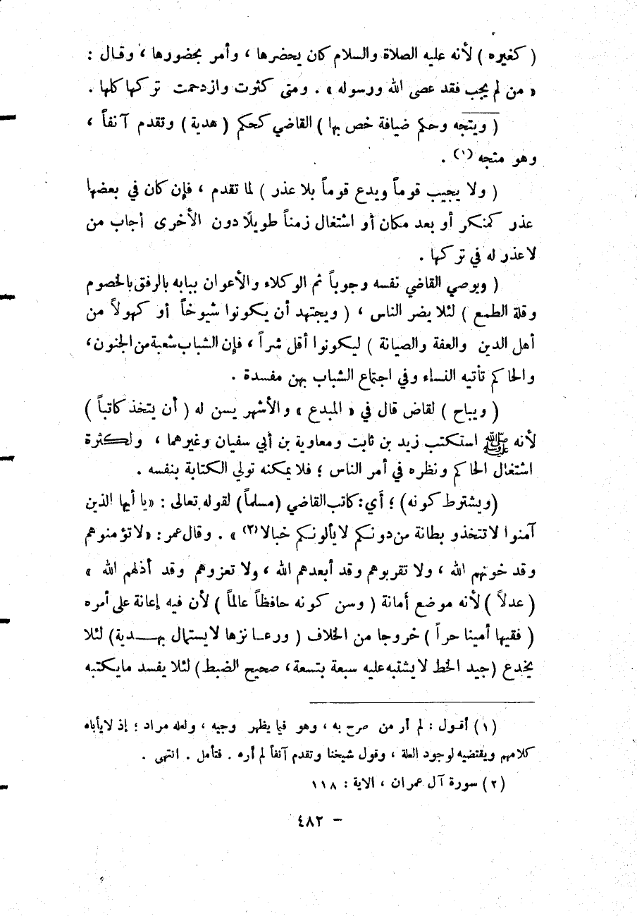 (وَيُشْتَرَطُ كَوْنُهُ) أَيْ: كَاتِبِ الْقَاضِي (مُسْلِمًا) لِقَوْلِهِ تَعَالَى: {يَا أَيُّهَا الَّذِينَ آمَنُوا لا تَتَّخِذُوا بِطَانَةً مِنْ دُونِكُمْ لا يَأْلُونَكُمْ خَبَالا} [آل عمران: 118]