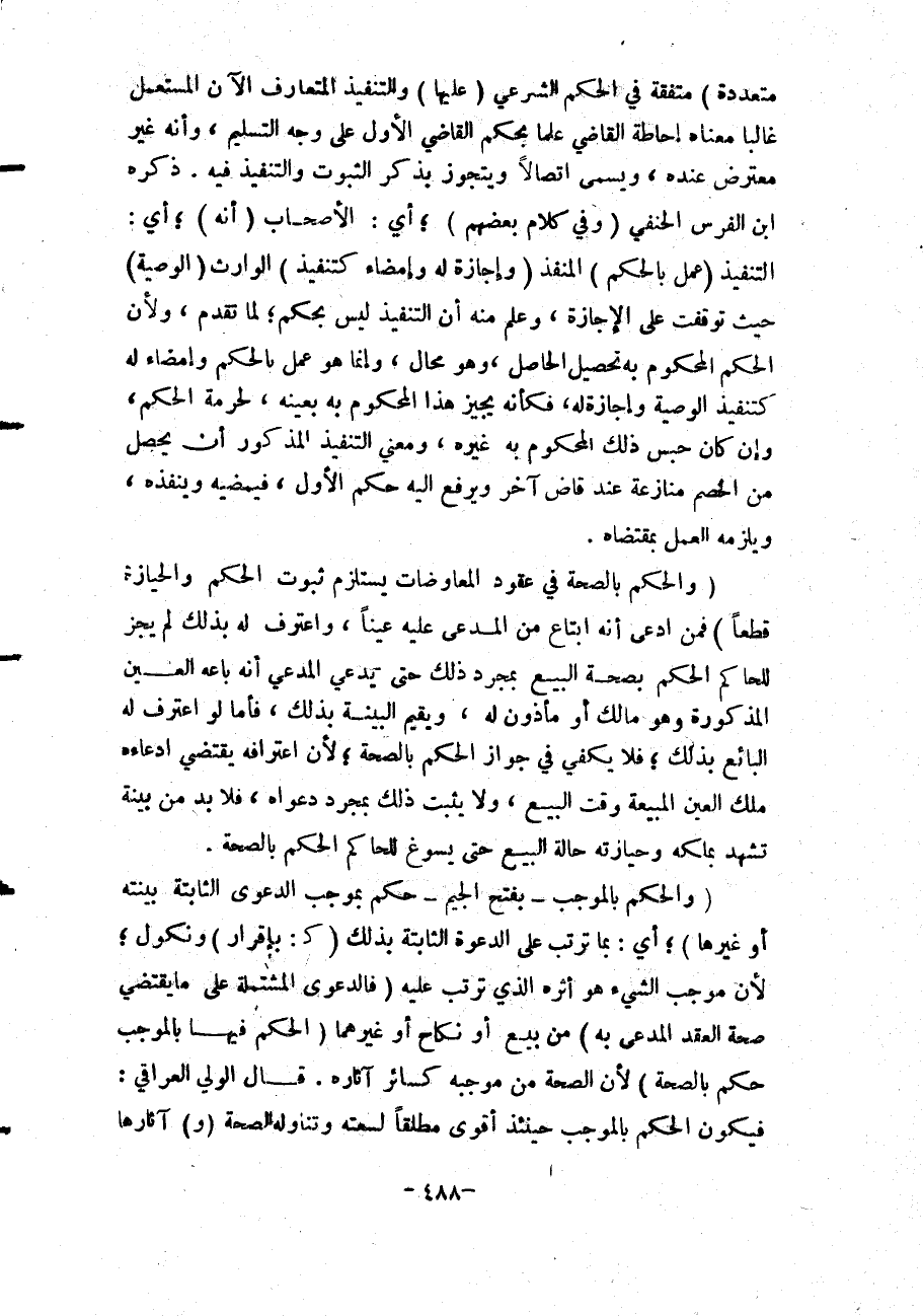 ذَكَرَهُ ابْنُ الْفَرَسِ الْحَنَفِيُّ (وَفِي كَلَامِ بَعْضِهِمْ) أَيْ: الْأَصْحَابِ (أَنَّهُ) أَيْ: التَّنْفِيذُ (عَمَلٌ بِالْحُكْمِ) الْمُنَفَّذِ (وَإِجَازَةٌ لَهُ وَإِمْضَاءٌ كَتَنْفِيذِ) الْوَارِثِ (الْوَصِيَّةَ) حَيْثُ تَوَقَّفَتْ عَلَى الْإِجَازَةِ، وَعُلِمَ مِنْهُ أَنَّ التَّنْفِيذَ لَيْسَ بِحُكْمٍ؛ لِمَا تَقَدَّمَ، وَلِأَنَّ الْحُكْمَ الْمَحْكُومَ بِهِ تَحْصِيلُ الْحَاصِلِ، وَهُوَ مُحَالٌ، وَإِنَّمَا هُوَ عَمَلٌ بِالْحُكْمِ وَإِمْضَاءٌ لَهُ كَتَنْفِيذِ الْوَصِيَّةِ وَإِجَازَةٌ لَهُ، فَكَأَنَّهُ يُجِيزُ هَذَا الْمَحْكُومَ بِهِ بِعَيْنِهِ، - لِحُرْمَةِ الْحُكْمِ، وَإِنْ كَانَ حَبْسُ ذَلِكَ الْمَحْكُومِ بِهِ غَيْرَهُ، وَمَعْنَى التَّنْفِيذِ الْمَذْكُورِ أَنْ يَحْصُلَ مِنْ الْخَصْمِ مُنَازَعَةٌ عِنْدَ قَاضٍ آخَرَ وَيُرْفَعُ إلَيْهِ حُكْمُ الْأَوَّلِ، فَيُمْضِيهِ وَيُنْفِذُهُ، وَيَلْزَمُهُ الْعَمَلُ بِمُقْتَضَاهُ.