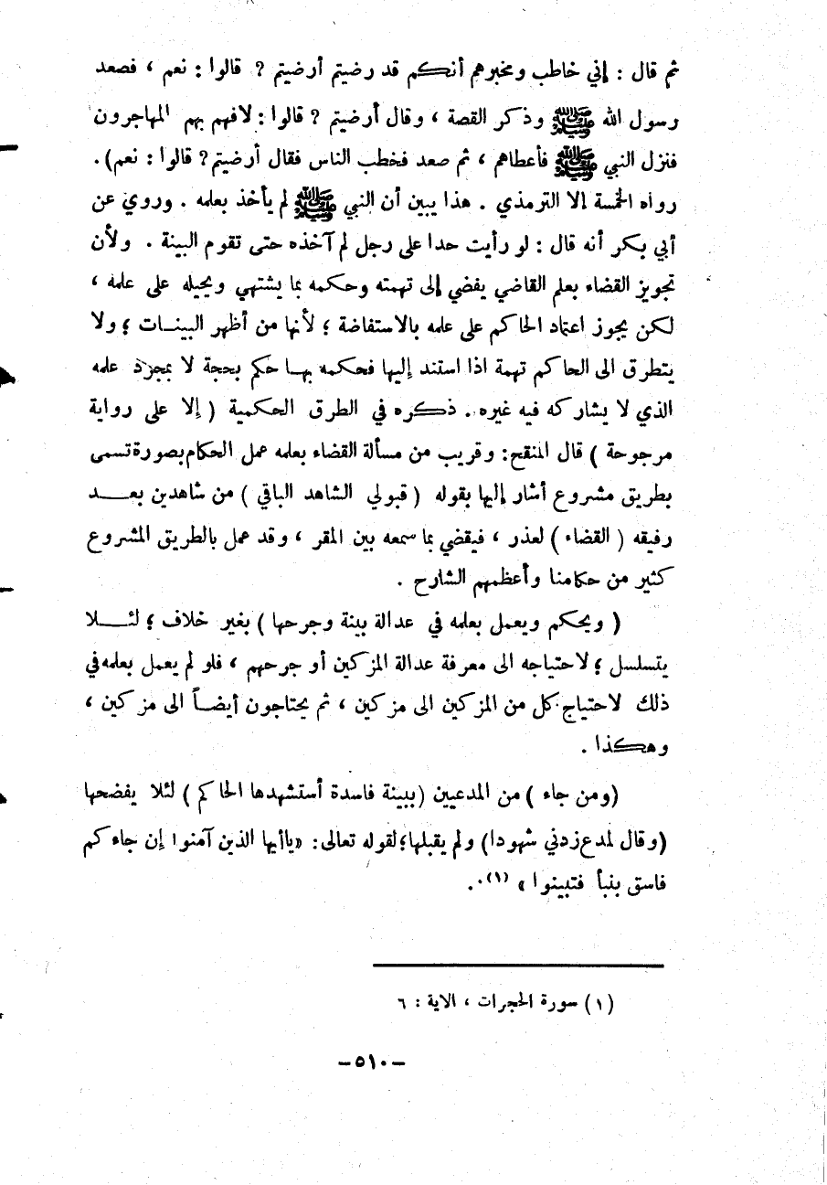 ثُمَّ قَالَ: إنِّي خَاطِبٌ وَمُخْبِرُهُمْ أَنَّكُمْ قَدْ رَضِيتُمْ أَرَضِيتُمْ؟ قَالُوا: نَعَمْ، فَصَعِدَ رَسُولُ اللَّهِ - صَلَّى اللَّهُ عَلَيْهِ وَسَلَّمَ - وَذَكَر الْقِصَّةَ، وَقَالَ أَرَضِيتُمْ؟ قَالُوا: لَا، فَهَمَّ بِهِمْ الْمُهَاجِرُونَ فَنَزَلَ النَّبِيُّ - صَلَّى اللَّهُ عَلَيْهِ وَسَلَّمَ - فَأَعْطَاهُمْ، ثُمَّ صَعِدَ فَخَطَبَ النَّاسَ فَقَالَ أَرَضِيتُمْ؟ قَالُوا: نَعَمْ» ) رَوَاهُ الْخَمْسَةُ إلَّا التِّرْمِذِيُّ هَذَا يُبَيِّنُ أَنَّ النَّبِيَّ - صَلَّى اللَّهُ عَلَيْهِ وَسَلَّمَ - لَمْ يَأْخُذْ بِعِلْمِهِ. وَرُوِيَ عَنْ أَبِي بَكْرٍ أَنَّهُ قَالَ: لَوْ رَأَيْتُ حَدًّا عَلَى رَجُلٍ لَمْ آخُذْهُ حَتَّى تَقُومَ الْبَيِّنَةُ. وَلِأَنَّ تَجْوِيزَ الْقَضَاءِ بِعِلْمِ الْقَاضِي يُفْضِي إلَى تُهْمَتِهِ وَحُكْمِهِ بِمَا يَشْتَهِي وَيُحِيلُهُ عَلَى عِلْمِهِ، لَكِنْ يَجُوزُ اعْتِمَادُ الْحَاكِمِ عَلَى عِلْمِهِ بِالِاسْتِفَاضَةِ؛ لِأَنَّهَا مِنْ أَظْهَرِ الْبَيِّنَاتِ؛ وَلَا يَتَطَرَّقُ إلَى الْحَاكِمِ تُهْمَةٌ إذَا اسْتَنَدَ إلَيْهَا فَحُكْمُهُ بِهَا حُكْمٌ بِحُجَّةٍ لَا بِمُجَرَّدِ عِلْمِهِ الَّذِي لَا يُشَارِكُهُ فِيهِ غَيْرُهُ. ذَكَرَهُ فِي الطُّرُقِ الْحُكْمِيَّةِ (إلَّا عَلَى رِوَايَةٍ مَرْجُوحَةٍ) قَالَ الْمُنَقَّحُ: وَقَرِيبٌ مِنْ مَسْأَلَةِ الْقَضَاءِ بِعِلْمِهِ عَمَلُ الْحُكَّامِ بِصُورَةٍ تُسَمَّى بِطَرِيقٍ مَشْرُوعٍ أَشَارَ إلَيْهَا بِقَوْلِهِ (قَبُولِي الشَّاهِدِ الْبَاقِي) مِنْ شَاهِدَيْنِ بَعْدَ رَفِيقِهِ (الْقَضَاءَ) لِعُذْرٍ، فَيَقْضِي بِمَا سَمِعَهُ بَيْنَ الْمُقِرِّ، وَقَدْ عَمِلَ بِالطَّرِيقِ الْمَشْرُوعِ كَثِيرٌ مِنْ حُكَّامِنَا وَأَعْظَمُهُمْ الشَّارِحُ.
