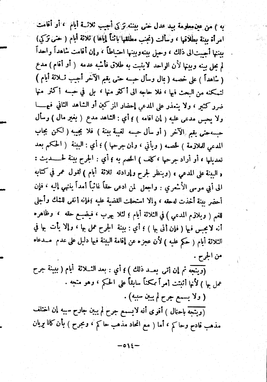 بِهِ) مِنْ عَيْنٍ مَعْلُومَةٍ بِيَدِ عَدْلٍ حَتَّى بَيِّنَتُهُ تُزَكَّى أُجِيبَ ثَلَاثَةَ أَيَّامٍ، أَوْ أَقَامَتْ امْرَأَةٌ بَيِّنَةً بِطَلَاقِهَا، وَسَأَلَتْ (تَجَنُّبَ مُطَلِّقِهَا بَائِنًا إيَّاهَا) ثَلَاثَةَ أَيَّامٍ (حَتَّى تُزَكِّي) بَيِّنَتَهَا أُجِيبَتْ إلَى ذَلِكَ، وَحِيلَ بَيْنَهُ وَبَيْنَهَا احْتِيَاطًا، وَإِنْ أَقَامَتْ شَاهِدًا وَاحِدًا لَمْ يُحَلْ بَيْنَهُ وَبَيْنَهَا لِأَنَّ الْوَاحِدَ لَا يَثْبُتُ بِهِ طَلَاقٌ فَأَشْبَهَ عَدَمَهُ (أَوْ أَقَامَ) مُدَّعٍ (شَاهِدًا) عَلَى خَصْمِهِ (بِمَالٍ وَسَأَلَ حَبْسَهُ حَتَّى يُقِيمَ الْآخَرَ أُجِيبَ ثَلَاثَةَ أَيَّامٍ) لِتَمَكُّنِهِ مِنْ الْبَحْثِ فِيهَا، فَلَا حَاجَةَ إلَى أَكْثَرَ مِنْهَا، بَلْ فِي حَبْسِهِ أَكْثَرَ مِنْهَا ضَرَرٌ كَثِيرٌ، وَلَا يَتَعَذَّرُ عَلَى الْمُدَّعِي إحْضَارُ الْمُزَكِّينَ أَوْ الشَّاهِدِ الثَّانِي فِيهَا وَلَا يُحْبَسُ مُدَّعًى عَلَيْهِ (إنْ أَقَامَهُ) ؛ أَيْ: الشَّاهِدَ مُدَّعٍ (بِغَيْرِ مَالٍ) وَسَأَلَ حَبْسَهُ حَتَّى يُقِيمَ الْآخَرَ (أَوْ سَأَلَ حَبْسَهُ لِغَيْبَةِ بَيِّنَةٍ) فَلَا يُجِيبُهُ (لَكِنْ يُجَابُ الْمُدَّعِي لِلْمُلَازَمَةِ) لِخَصْمِهِ (وَيَأْتِي، وَإِنْ جَرَحَهَا) ؛ أَيْ: الْبَيِّنَةَ (الْحُكْمُ بَعْدَ تَعْدِيلِهَا، أَوْ أَرَادَ جَرْحَهَا، كُلِّفَ) الْخَصْمُ بِهِ؛ أَيْ: الْجَرْحِ بِبَيِّنَةٍ لِحَدِيثِ: «الْبَيِّنَةُ عَلَى الْمُدَّعِي» (وَيُنْظَرُ لِجَرْحٍ وَإِرَادَتِهِ ثَلَاثَةَ أَيَّامٍ) لِقَوْلِ عُمَرَ فِي كِتَابِهِ إلَى أَبِي مُوسَى الْأَشْعَرِيِّ: وَاجْعَلْ لِمَنْ ادَّعَى حَقًّا غَائِبًا أَمَدًا يَنْتَهِي إلَيْهِ، فَإِنْ أَحْضَرَ بَيِّنَةً أَخَذْتَ لَهُ حَقَّهُ، وَإِلَّا اسْتَحْلَلْتَ الْقَضِيَّةَ عَلَيْهِ؛ فَإِنَّهُ أَنْفَى لِلشَّكِّ وَأَجْلَى لِلْغَمِّ (وَيُلَازَمُ الْمُدَّعِي) فِي الثَّلَاثَةِ أَيَّامٍ؛ لِئَلَّا يَهْرَبَ، فَيَضِيعَ حَقُّهُ، وَظَاهِرُهُ أَنَّهُ لَا يُحْبَسُ فِيهَا (فَإِنْ أَتَى بِهَا) ؛ أَيْ: بَيِّنَةِ الْجَرْحِ عُمِلَ بِهَا، وَإِلَّا يَأْتِ بِهَا فِي الثَّلَاثَةِ أَيَّامٍ (حُكِمَ عَلَيْهِ) لِأَنَّ عَجْزَهُ عَنْ إقَامَةِ الْبَيِّنَةِ فِيهَا دَلِيلٌ عَلَى عَدَمِ مُدَّعَاهُ مِنْ الْجَرْحِ.