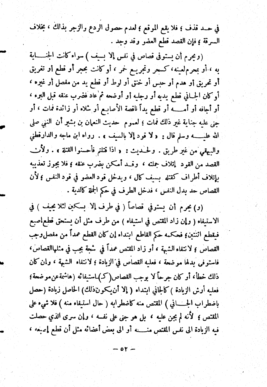 (وَيَحْرُمُ أَنْ يُسْتَوْفَى قِصَاصٌ فِي نَفْسٍ إلَّا بِسَيْفٍ) سَوَاءٌ كَانَتْ الْجِنَايَةُ بِهِ أَوْ بِمُحَرَّمٍ لِعَيْنِهِ، كَسِحْرٍ وَتَجْرِيعِ خَمْرٍ، أَوْ كَانَتْ بِحَجَرٍ أَوْ قَطْعٍ أَوْ تَغْرِيقٍ أَوْ تَحْرِيقٍ أَوْ هَدْمٍ أَوْ حَبْسٍ أَوْ خَنْقٍ أَوْ لَوْطٍ أَوْ قَطْعِ يَدٍ مِنْ مِفْصَلٍ أَوْ غَيْرِهِ، أَوْ كَانَ الْجَانِي قَطَعَ يَدَيْهِ أَوْ رِجْلَيْهِ أَوْ أَوْضَحَهُ ثُمَّ عَادَ فَضَرَبَ عُنُقَهُ قَبْلَ الْبُرْءِ، أَوْ أَجَافَهُ أَوْ أَمَّهُ أَوْ قَطَعَ يَدًا نَاقِصَةَ الْأَصَابِعِ أَوْ شَلَّاءَ أَوْ زَائِدَةً فَمَاتَ، أَوْ جَنَى عَلَيْهِ جِنَايَةً غَيْرَ ذَلِكَ فَمَاتَ؛ لِعُمُومِ حَدِيثِ النُّعْمَانِ بْنِ بَشِيرٍ أَنَّ النَّبِيَّ - صَلَّى اللَّهُ عَلَيْهِ وَسَلَّمَ - قَالَ: «لَا قَوَدَ إلَّا بِالسَّيْفِ» رَوَاهُ ابْنُ مَاجَهْ، وَالدَّارَقُطْنِيّ وَالْبَيْهَقِيُّ مِنْ غَيْرِ طَرِيقٍ.