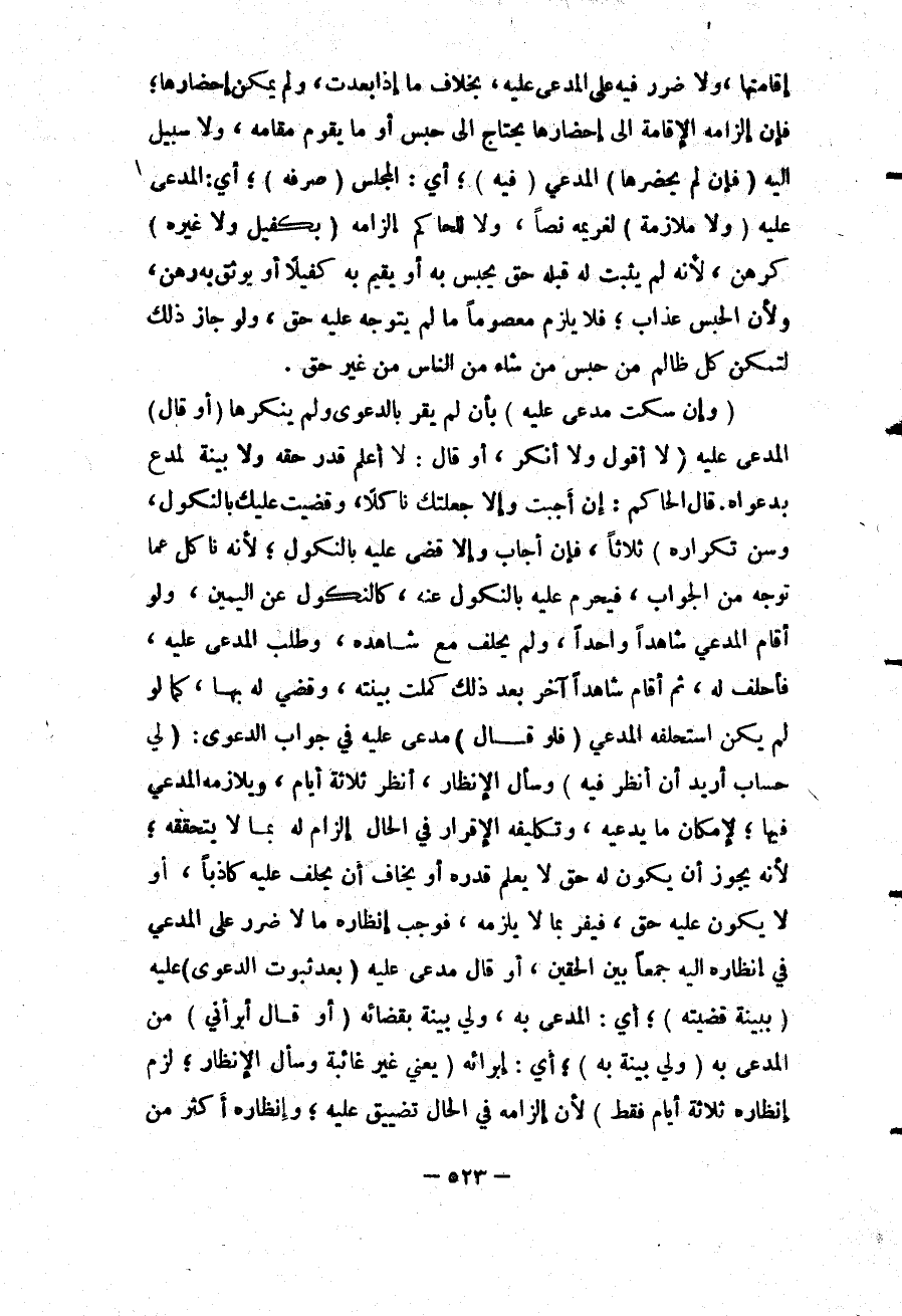 (فَلَوْ قَالَ) مُدَّعًى عَلَيْهِ فِي جَوَابِ الدَّعْوَى: (لِي حِسَابٌ أُرِيدُ أَنْ أَنْظُرَ فِيهِ) وَسَأَلَ الْإِنْظَارَ، أُنْظِرَ ثَلَاثَةَ أَيَّامٍ، وَيُلَازِمُهُ الْمُدَّعِي فِيهَا؛ لِإِمْكَانِ مَا يَدَّعِيهِ، وَتَكْلِيفُهُ الْإِقْرَارَ فِي الْحَالِ إلْزَامٌ لَهُ بِمَا لَا يَتَحَقَّقُهُ؛ لِأَنَّهُ يَجُوزُ أَنْ يَكُونَ لَهُ حَقٌّ لَا يَعْلَمُ قَدْرَهُ أَوْ يَخَافُ أَنْ يَحْلِفَ عَلَيْهِ كَاذِبًا، أَوْ لَا يَكُونَ عَلَيْهِ حَقٌّ، فَيُقِرَّ بِمَا لَا يَلْزَمُهُ، فَوَجَبَ إنْظَارُهُ مَا لَا ضَرَرَ عَلَى الْمُدَّعِي فِي إنْظَارِهِ إلَيْهِ جَمْعًا بَيْنَ الْحَقَّيْنِ، أَوْ قَالَ مُدَّعًى عَلَيْهِ (بَعْدَ ثُبُوتِ الدَّعْوَى) عَلَيْهِ (بِبَيِّنَةٍ قَضَيْته) ؛ أَيْ: الْمُدَّعَى بِهِ، وَلِي بَيِّنَةٌ بِقَضَائِهِ (أَوْ قَالَ أَبْرَأَنِي) مِنْ الْمُدَّعَى بِهِ (وَلِي بَيِّنَةٌ بِهِ) ؛ أَيْ: إبْرَائِهِ (يَعْنِي غَيْرَ غَائِبَةٍ وَسَأَلَ الْإِنْظَارَ، لَزِمَ إنْظَارُهُ ثَلَاثَةَ أَيَّامٍ فَقَطْ) لِأَنَّ إلْزَامَهُ فِي الْحَالِ تَضْيِيقٌ عَلَيْهِ؛ وَإِنْظَارُهُ أَكْثَرَ مِنْ