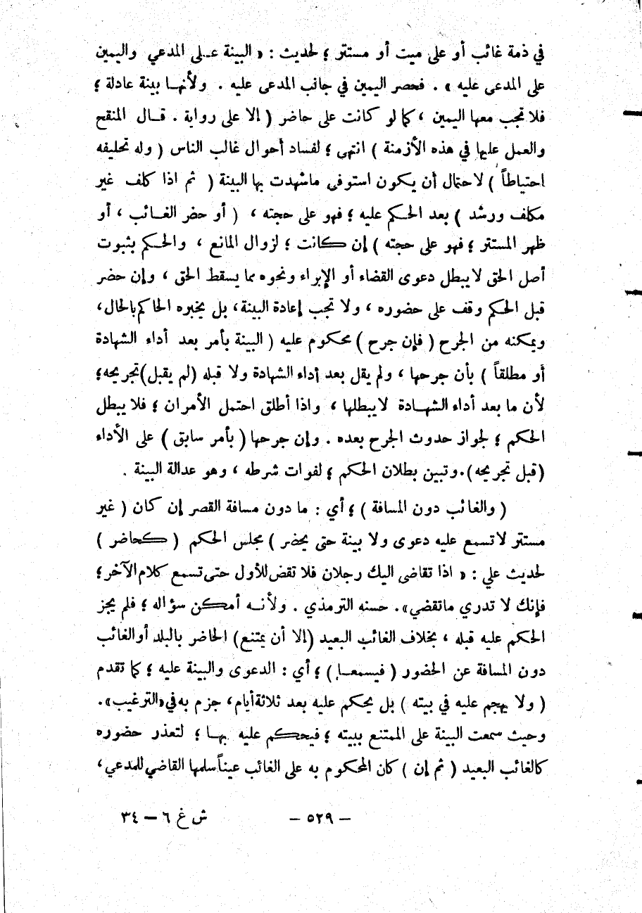 (وَالْغَائِبُ دُونَ الْمَسَافَةِ) ؛ أَيْ: مَا دُونَ مَسَافَةِ الْقَصْرِ إنْ كَانَ (غَيْرَ مُسْتَتِرٍ لَا تُسْمَعُ عَلَيْهِ دَعْوَى وَلَا بَيِّنَةٌ حَتَّى يَحْضُرَ) مَجْلِسَ الْحُكْمِ (كَحَاضِرٍ) لِحَدِيثِ عَلِيٍّ: «إذَا تَقَاضَى إلَيْك رَجُلَانِ فَلَا تَقْضِ لِلْأَوَّلِ حَتَّى تَسْمَعَ كَلَامَ الْآخَرِ؛ فَإِنَّك لَا تَدْرِي مَا تَقْضِي» . حَسَّنَهُ التِّرْمِذِيُّ.