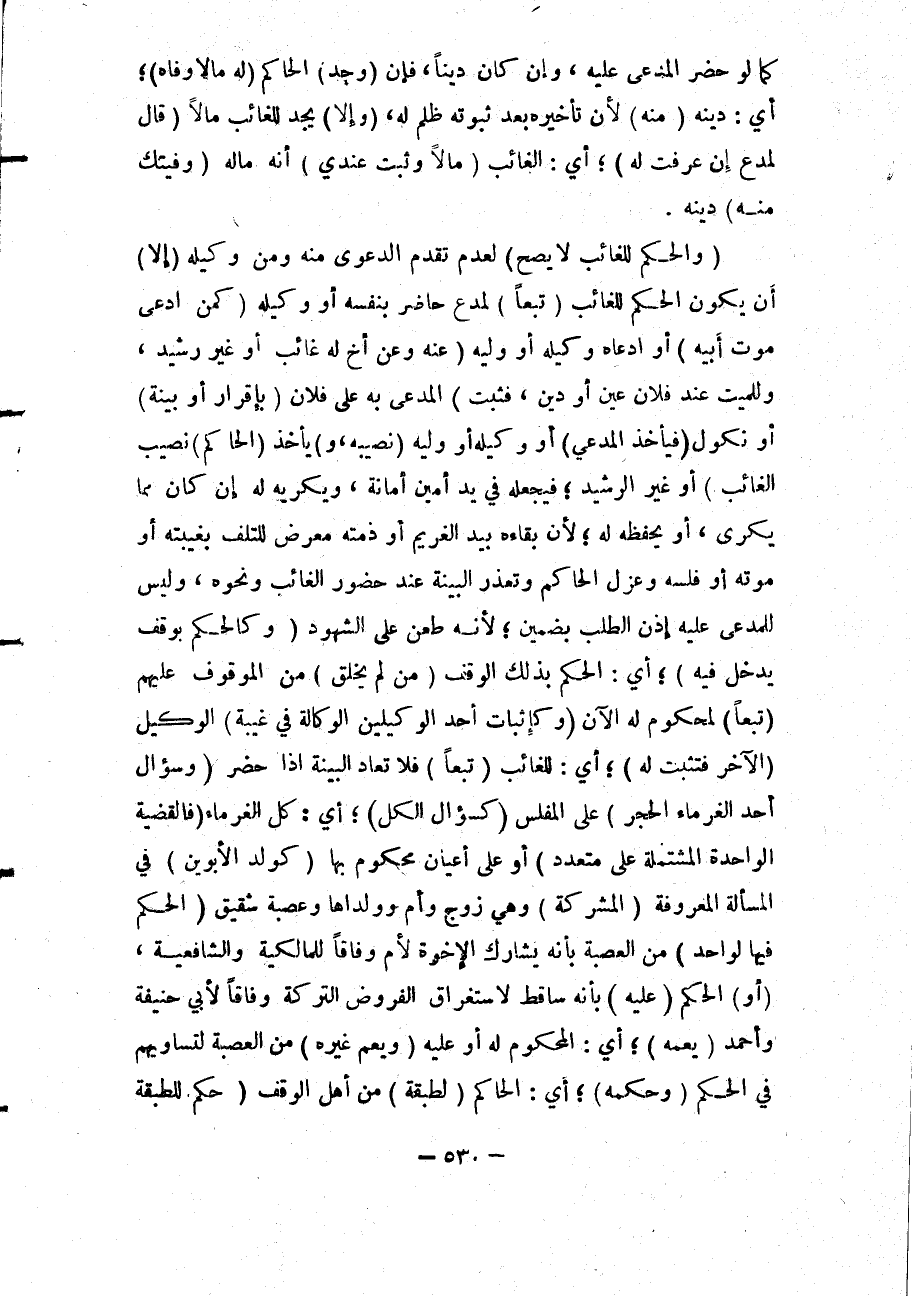 (وَالْحُكْمُ لِلْغَائِبِ لَا يَصِحُّ) لِعَدَمِ تَقَدُّمِ الدَّعْوَى مِنْهُ وَمِنْ وَكِيلِهِ (إلَّا) أَنْ يَكُونَ الْحُكْمُ لِلْغَائِبِ (تَبَعًا) لِمُدَّعٍ حَاضِرٍ بِنَفْسِهِ أَوْ وَكِيلِهِ (كَمَنْ ادَّعَى مَوْتَ أَبِيهِ) أَوْ ادَّعَاهُ وَكِيلُهُ أَوْ وَلِيُّهُ (عَنْهُ وَعَنْ أَخٍ لَهُ غَائِبٍ أَوْ غَيْرِ رَشِيدٍ، وَلِلْمَيِّتِ عِنْدَ فُلَانٍ عَيْنٌ أَوْ دَيْنٌ، فَثَبَتَ) الْمُدَّعَى بِهِ عَلَى فُلَانٍ (بِإِقْرَارٍ أَوْ بَيِّنَةٍ) أَوْ نُكُولٍ (فَيَأْخُذُ الْمُدَّعِي) أَوْ وَكِيلُهُ أَوْ وَلِيُّهُ (نَصِيبَهُ، وَ) يَأْخُذُ (الْحَاكِمُ نَصِيبَ الْغَائِبِ) أَوْ غَيْرِ الرَّشِيدِ؛ فَيَجْعَلُهُ فِي يَدِ أَمِينٍ أَمَانَةً، وَيُكْرِيه لَهُ إنْ كَانَ مِمَّا يُكْرَى، أَوْ يَحْفَظُهُ لَهُ؛ لِأَنَّ بَقَاءَهُ بِيَدِ الْغَرِيمِ أَوْ ذِمَّتِهِ مُعَرَّضٌ لِلتَّلَفِ بِغَيْبَتِهِ أَوْ مَوْتِهِ أَوْ فَلَسِهِ وَعَزْلِ الْحَاكِمِ وَتَعَذُّرِ الْبَيِّنَةِ عِنْدَ حُضُورِ الْغَائِبِ وَنَحْوِهِ، وَلَيْسَ لِلْمُدَّعَى عَلَيْهِ إذَنْ الطَّلَبُ بِضَمِينٍ؛ لِأَنَّهُ طَعْنٌ عَلَى الشُّهُودِ (وَكَالْحُكْمِ بِوَقْفٍ يَدْخُلُ فِيهِ) ؛ أَيْ: الْحُكْمِ بِذَلِكَ الْوَقْفِ (مَنْ لَمْ يُخْلَقْ) مِنْ الْمَوْقُوفِ عَلَيْهِمْ (تَبَعًا) لِمَحْكُومٍ لَهُ الْآنَ (وَكَإِثْبَاتِ أَحَدِ الْوَكِيلَيْنِ الْوَكَالَةَ فِي غَيْبَةِ) الْوَكِيلِ (الْآخَرِ فَتَثْبُتُ لَهُ) ؛ أَيْ: لِلْغَائِبِ (تَبَعًا) فَلَا تُعَادُ الْبَيِّنَةُ إذَا حَضَرَ (وَسُؤَالُ أَحَدِ الْغُرَمَاءِ الْحَجْرَ) عَلَى الْمُفْلِسِ (كَسُؤَالِ الْكُلِّ) ؛ أَيْ: كُلِّ الْغُرَمَاءِ (فَالْقَضِيَّةُ الْوَاحِدَةُ الْمُشْتَمِلَةُ عَلَى مُتَعَدِّدٍ) أَوْ عَلَى أَعْيَانٍ مَحْكُومٍ بِهَا (كَوَلَدِ الْأَبَوَيْنِ) فِي الْمَسْأَلَةِ الْمَعْرُوفَةِ (الْمُشَرِّكَةِ) وَهِيَ زَوْجٌ وَأُمٌّ وَوَلَدَاهَا وَعَصَبَةٌ شَقِيقٌ (الْحُكْمُ فِيهَا لِوَاحِدٍ) مِنْ الْعَصَبَةِ بِأَنَّهُ يُشَارِكُ الْإِخْوَةَ لِأُمٍّ وِفَاقًا لِلْمَالِكِيَّةِ وَالشَّافِعِيَّةِ، (أَوْ) الْحُكْمُ (عَلَيْهِ) بِأَنَّهُ سَاقِطٌ لِاسْتِغْرَاقِ الْفُرُوضِ التَّرِكَةَ وِفَاقًا لِأَبِي حَنِيفَةَ وَأَحْمَدَ (يَعُمُّهُ) ؛ أَيْ: الْمَحْكُومَ لَهُ أَوْ عَلَيْهِ (وَيَعُمُّ غَيْرَهُ) مِنْ الْعَصَبَةِ لِتَسَاوِيهِمْ فِي الْحُكْمِ (وَحُكْمُهُ) ؛ أَيْ: الْحَاكِمِ (لِطَبَقَةٍ) مِنْ أَهْلِ الْوَقْفِ (حُكْمٌ لِلطَّبَقَةِ