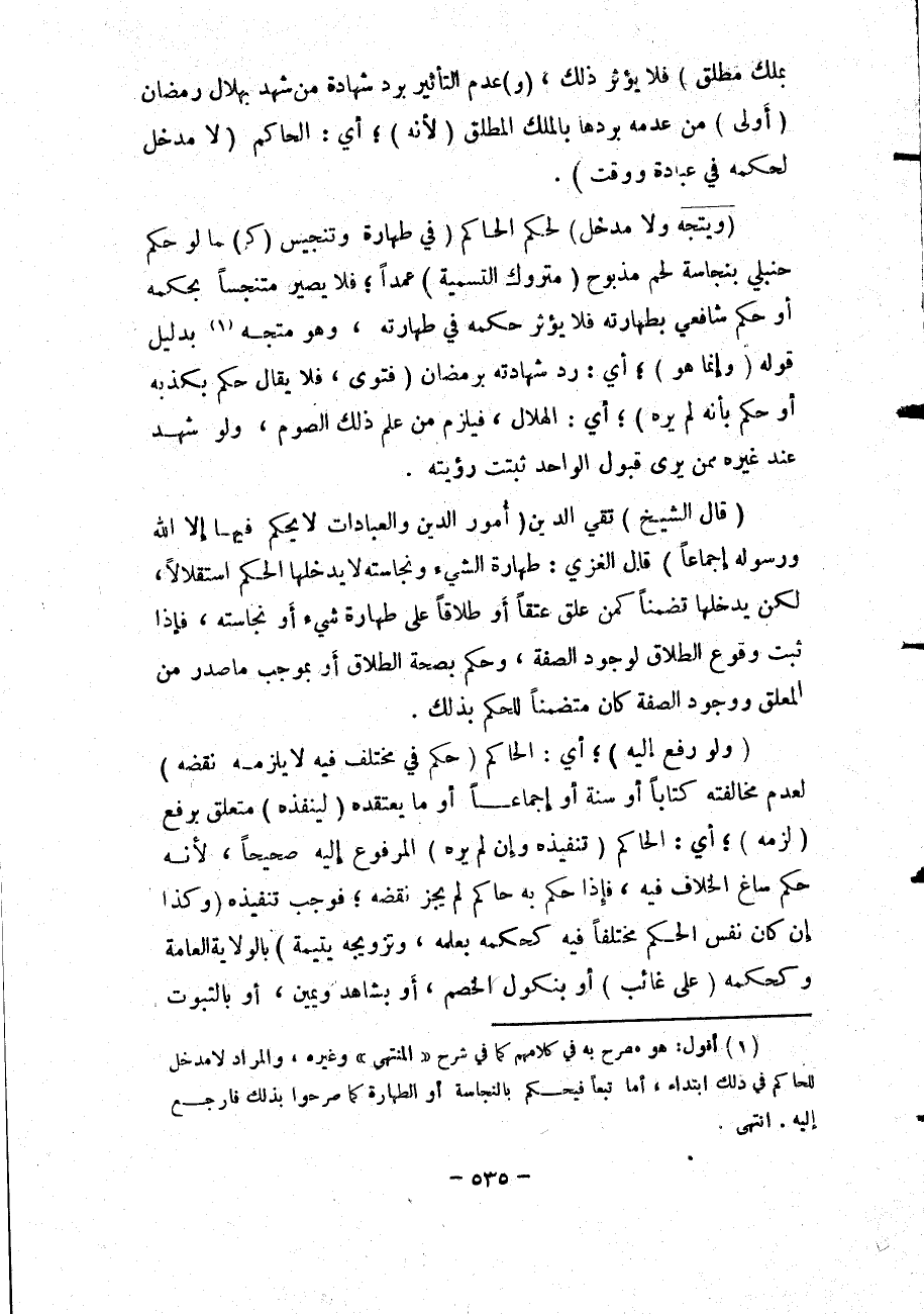 (وَيَتَّجِهُ وَلَا مَدْخَلَ) لِحُكْمِ الْحَاكِمِ (فِي طَهَارَةٍ) وَتَنْجِيسٍ (ك) مَا لَوْ حَكَمَ حَنْبَلِيٌّ بِنَجَاسَةِ لَحْمٍ مَذْبُوحٍ (مَتْرُوكِ التَّسْمِيَةِ) عَمْدًا؛ فَلَا يَصِيرُ مُتَنَجِّسًا بِحُكْمِهِ أَوْ حَكَمَ شَافِعِيٌّ بِطَهَارَتِهِ فَلَا يُؤَثِّرُ حُكْمُهُ فِي طَهَارَتِهِ، وَهُوَ مُتَّجِهٌ بِدَلِيلِ قَوْلِهِ (وَإِنَّمَا هُوَ) ؛ أَيْ: رَدُّ شَهَادَتِهِ بِرَمَضَانَ (فَتْوَى، فَلَا يُقَالُ حَكَمَ بِكَذِبِهِ أَوْ حَكَمَ بِأَنَّهُ لَمْ يَرَهُ) ؛ أَيْ: الْهِلَالَ؛ فَيَلْزَمُ مَنْ عَلِمَ ذَلِكَ الصَّوْمُ، وَلَوْ شَهِدَ عِنْدَ غَيْرِهِ مِمَّنْ يَرَى قَبُولَ الْوَاحِدِ ثَبَتَتْ رُؤْيَتُهُ.