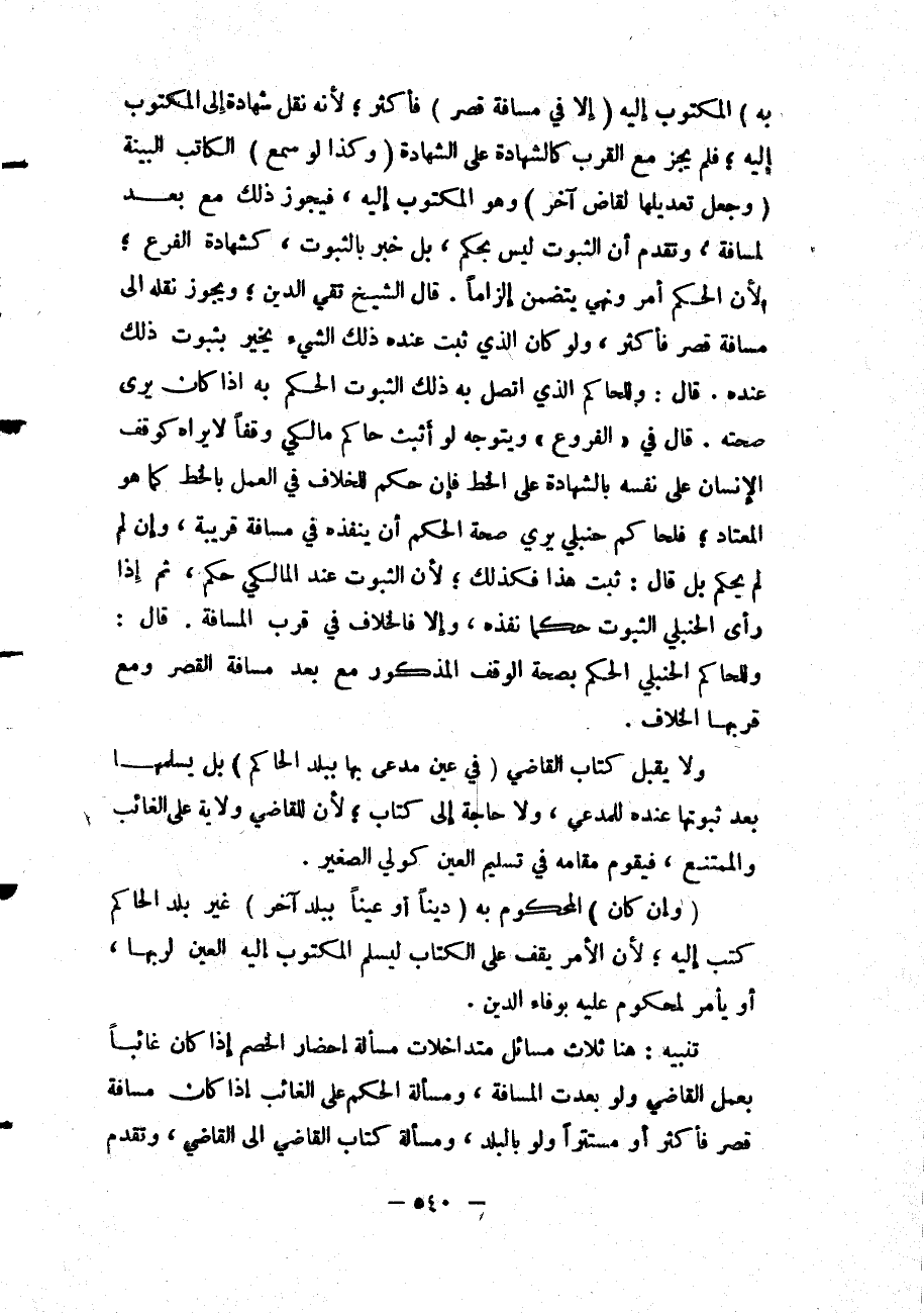 قَالَ فِي " الْفُرُوعِ " وَيَتَوَجَّهُ لَوْ أَثْبَتَ حَاكِمٌ مَالِكِيٌّ وَقْفًا لَا يَرَاهُ كَوَقْفِ الْإِنْسَانِ عَلَى نَفْسِهِ بِالشَّهَادَةِ عَلَى الْخَطِّ فَإِنْ حَكَمَ لِلْخِلَافِ فِي الْعَمَلِ بِالْخَطِّ كَمَا هُوَ الْمُعْتَادُ؛ فَلِحَاكِمٍ حَنْبَلِيٍّ يَرَى صِحَّةَ الْحُكْمِ أَنْ يُنَفِّذَهُ فِي مَسَافَةٍ قَرِيبَةٍ، وَإِنْ لَمْ لَمْ يَحْكُمْ بَلْ قَالَ: ثَبَتَ هَذَا فَكَذَلِكَ؛ لِأَنَّ الثُّبُوتَ عِنْدَ الْمَالِكِيِّ حُكْمٌ، ثُمَّ إذَا رَأَى الْحَنْبَلِيُّ الثُّبُوتَ حُكْمًا نَفَّذَهُ، وَإِلَّا فَالْخِلَافُ فِي قُرْبِ الْمَسَافَةِ.