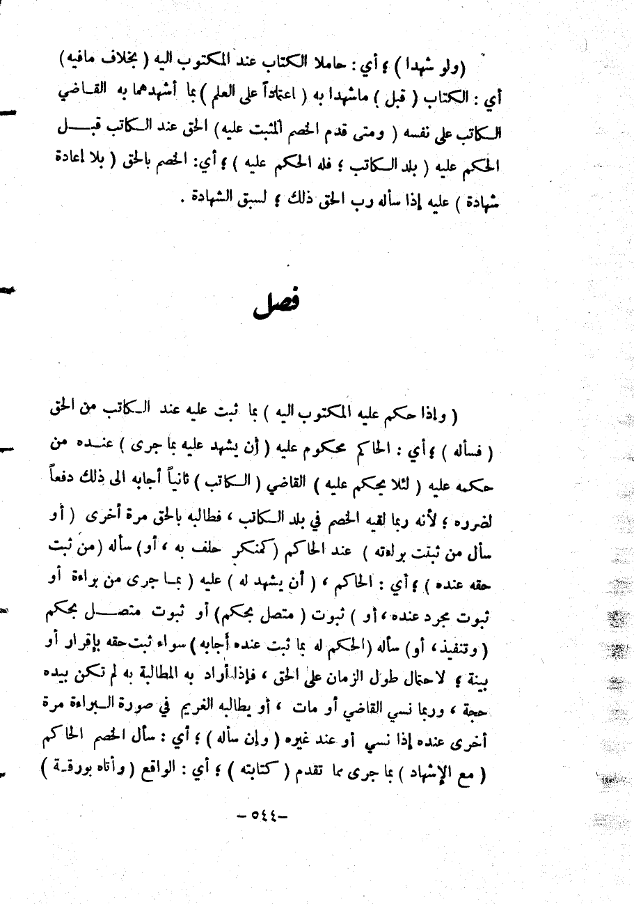 فَصْلٌ (وَإِذَا) حَكَمَ عَلَيْهِ الْمَكْتُوبُ إلَيْهِ بِمَا ثَبَتَ عَلَيْهِ عِنْدَ الْكَاتِبِ مِنْ الْحَقِّ (فَسَأَلَهُ) ؛ أَيْ: الْحَاكِمَ مَحْكُومٌ عَلَيْهِ (أَنْ يَشْهَدَ عَلَيْهِ بِمَا جَرَى) عِنْدَهُ مِنْ حُكْمِهِ عَلَيْهِ (لِئَلَّا يَحْكُمَ عَلَيْهِ) الْقَاضِي (الْكَاتِبُ) ثَانِيًا أَجَابَهُ إلَى ذَلِكَ دَفْعًا لِضَرَرِهِ؛ لِأَنَّهُ رُبَّمَا لَقِيَهُ الْخَصْمُ فِي بَلَدِ الْكَاتِبِ، فَطَالَبَهُ بِالْحَقِّ مَرَّةً أُخْرَى (أَوْ سَأَلَ مَنْ ثَبَتَتْ بَرَاءَتُهُ) عِنْدَ الْحَاكِمِ (كَمُنْكِرٍ حَلَفَ بِهِ، أَوْ) سَأَلَهُ (مَنْ ثَبَتَ حَقُّهُ عِنْدَهُ) ؛ أَيْ: الْحَاكِمِ، (أَنْ يَشْهَدَ لَهُ) عَلَيْهِ (بِمَا جَرَى مِنْ بَرَاءَةٍ أَوْ ثُبُوتِ مُجَرَّدٍ عِنْدَهُ، أَوْ) ثُبُوتِ (مُتَّصِلٍ بِحُكْمٍ) أَوْ ثُبُوتِ مُتَّصِلٍ بِحُكْمٍ (وَتَنْفِيذٍ، أَوْ) سَأَلَهُ الْحُكْمَ لَهُ بِمَا ثَبَتَ عِنْدَهُ (أَجَابَهُ) سَوَاءٌ ثَبَتَ حَقُّهُ بِإِقْرَارٍ أَوْ بَيِّنَةٍ؛ لِاحْتِمَالِ طُولِ الزَّمَانِ عَلَى الْحَقِّ، فَإِذَا أَرَادَ بِهِ الْمُطَالَبَةَ بِهِ لَمْ تَكُنْ بِيَدِهِ حُجَّةٌ، وَرُبَّمَا نَسِيَ الْقَاضِي أَوْ مَاتَ، أَوْ يُطَالِبُهُ الْغَرِيمُ فِي صُورَةِ الْبَرَاءَةِ مَرَّةً أُخْرَى عِنْدَهُ إذَا نَسِيَ أَوْ عِنْدَ غَيْرِهِ (وَإِنْ سَأَلَهُ) ؛ أَيْ: سَأَلَ الْخَصْمُ الْحَاكِمَ (مَعَ الْإِشْهَادِ) بِمَا جَرَى مِمَّا تَقَدَّمَ (كِتَابَتَهُ) ؛ أَيْ: الْوَاقِعِ (وَأَتَاهُ بِوَرَقَةٍ)