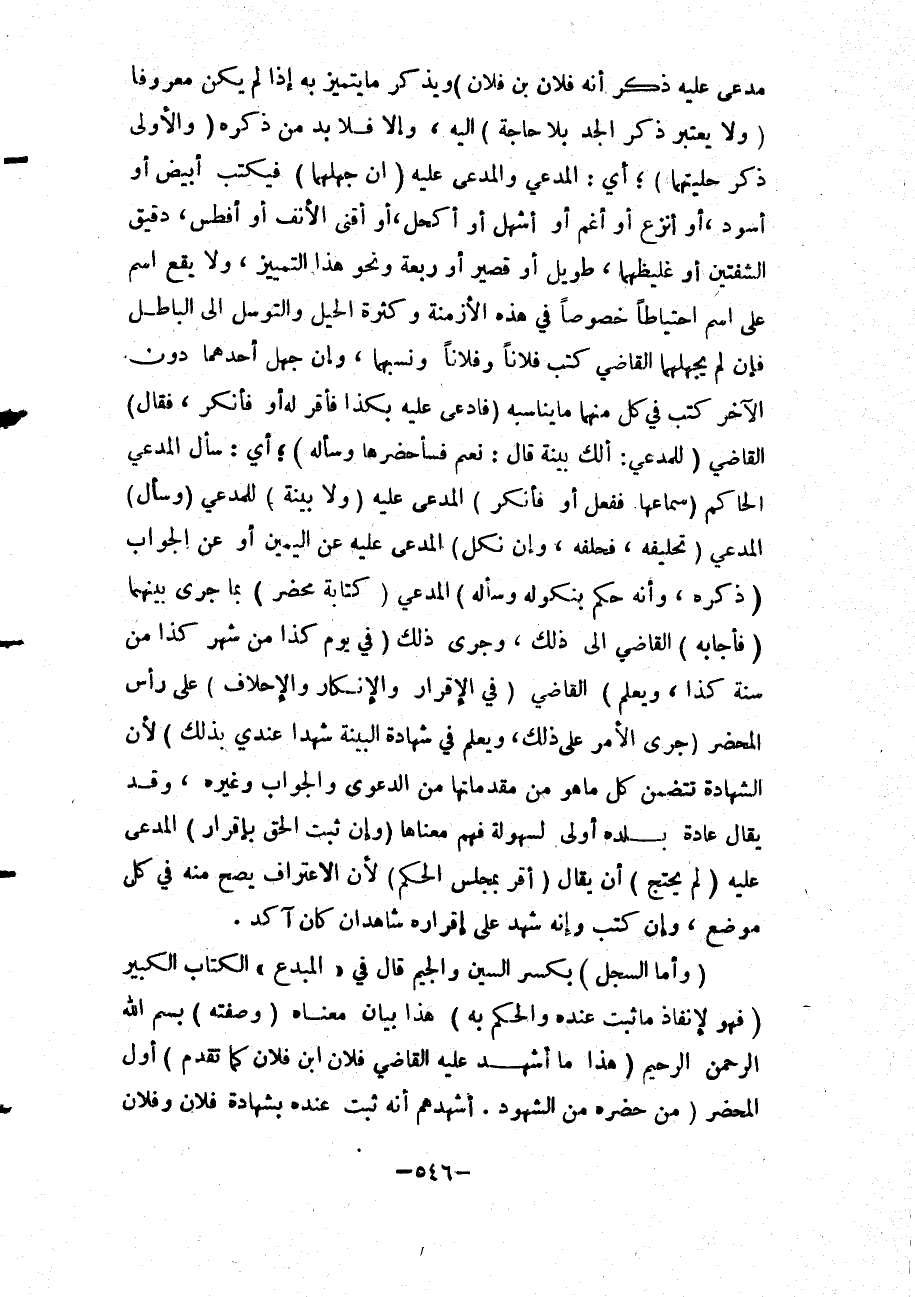 مُدَّعًى عَلَيْهِ ذَكَرَ أَنَّهُ فُلَانُ بْنُ فُلَانٍ) وَيَذْكُرُ مَا يَتَمَيَّزُ بِهِ إذَا لَمْ يَكُنْ مَعْرُوفًا (وَلَا يُعْتَبَرُ ذِكْرُ الْحَدِّ بِلَا حَاجَةٍ) إلَيْهِ، وَإِلَّا فَلَا بُدَّ مِنْ ذِكْرِهِ (وَالْأَوْلَى ذِكْرُ حِلْيَتِهِمَا) ؛ أَيْ: الْمُدَّعِي وَالْمُدَّعَى عَلَيْهِ (إنْ جَهِلَهُمَا) فَيُكْتَبُ أَبْيَضُ أَوْ أَسْوَدُ، أَوْ أَنْزَعُ أَوْ أَغَمُّ أَوْ أَشْهَلُ أَوْ أَكْحَلُ، أَوْ أَقْنَى الْأَنْفِ أَوْ أَفْطَسُ، دَقِيقُ الشَّفَتَيْنِ أَوْ غَلِيظُهُمَا، طَوِيلٌ أَوْ قَصِيرٌ أَوْ رَبْعَةٌ وَنَحْوُ هَذَا التَّمْيِيزِ، وَلَا يَقَعُ اسْمٌ عَلَى اسْمٍ احْتِيَاطًا خُصُوصًا فِي هَذِهِ الْأَزْمِنَةِ وَكَثْرَةِ الْحِيَلِ وَالتَّوَسُّلِ إلَى الْبَاطِلِ فَإِنْ لَمْ يَجْهَلْهُمَا الْقَاضِي كَتَبَ فُلَانًا وَفُلَانًا وَنَسَبَهُمَا، وَإِنْ جَهِلَ أَحَدَهُمَا دُونَ الْآخَرِ كَتَبَ فِي كُلٍّ مِنْهُمَا مَا يُنَاسِبُهُ (فَادَّعَى عَلَيْهِ بِكَذَا فَأَقَرَّ لَهُ أَوْ فَأَنْكَرَ، فَقَالَ) الْقَاضِي (لِلْمُدَّعِي: أَلَك بَيِّنَةٌ قَالَ: نَعَمْ فَسَأُحْضِرُهَا وَسَأَلَهُ) ؛ أَيْ: سَأَلَ الْمُدَّعِي الْحَاكِمُ (سَمَاعَهَا فَفَعَلَ أَوْ فَأَنْكَرَ) الْمُدَّعَى عَلَيْهِ (وَلَا بَيِّنَةَ) لِلْمُدَّعِي (وَسَأَلَ) الْمُدَّعِي (تَحْلِيفَهُ، فَحَلَّفَهُ، وَإِنْ نَكَلَ) الْمُدَّعَى عَلَيْهِ عَنْ الْيَمِينِ أَوْ عَنْ الْجَوَابِ (ذَكَّرَهُ، وَأَنَّهُ حَكَمَ بِنُكُولِهِ وَسَأَلَهُ) الْمُدَّعِي (كِتَابَةَ مَحْضَرٍ) بِمَا جَرَى بَيْنَهُمَا (فَأَجَابَهُ) الْقَاضِي إلَى ذَلِكَ، وَجَرَى ذَلِكَ (فِي يَوْمِ كَذَا مِنْ شَهْرِ كَذَا مِنْ سَنَةِ كَذَا، وَيُعْلِمُ) الْقَاضِي (فِي الْإِقْرَارِ وَالْإِنْكَارِ وَالْإِحْلَافِ) عَلَى رَأْسِ الْمَحْضَرِ (جَرَى الْأَمْرُ عَلَى ذَلِكَ، وَيُعْلِمُ فِي شَهَادَةِ الْبَيِّنَةِ شَهِدَا عِنْدِي بِذَلِكَ) لِأَنَّ الشَّهَادَةَ تَتَضَمَّنُ كُلَّ مَا هُوَ مِنْ مُقَدَّمَاتِهَا مِنْ الدَّعْوَى وَالْجَوَابِ وَغَيْرِهِ، وَقَدْ يُقَالُ عَادَةُ بَلَدِهِ أَوْلَى لِسُهُولَةِ فَهْمِ مَعْنَاهَا (وَإِنْ ثَبَتَ الْحَقُّ بِإِقْرَارِ) الْمُدَّعَى عَلَيْهِ (لَمْ يَحْتَجْ) أَنْ يُقَالَ (أَقَرَّ بِمَجْلِسِ الْحُكْمِ) لِأَنَّ الِاعْتِرَافَ يَصِحُّ مِنْهُ فِي كُلِّ مَوْضِعٍ، وَإِنْ كَتَبَ وَإِنَّهُ شَهِدَ عَلَى إقْرَارِهِ شَاهِدَانِ كَانَ آكَدَ.