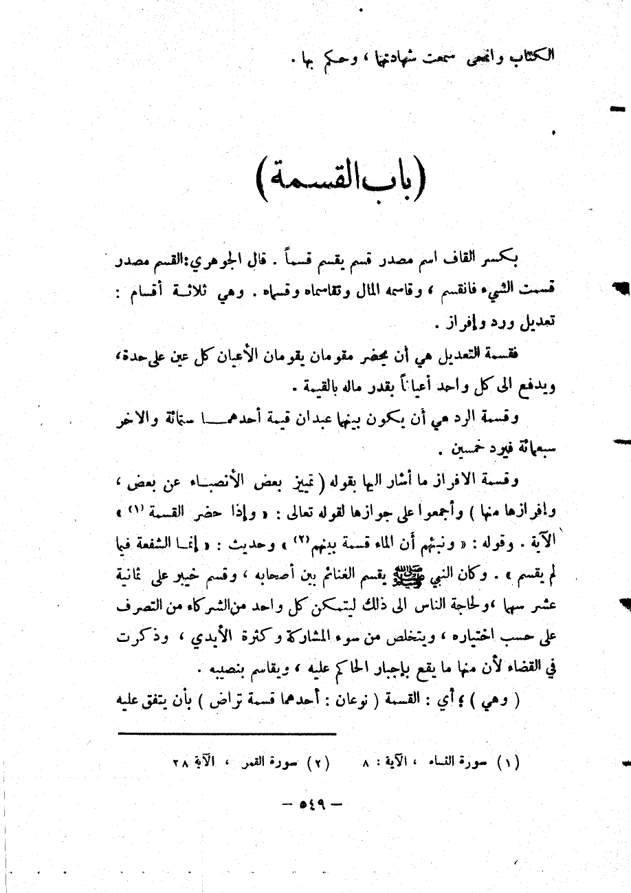 وَقَوْلِهِ: {وَنَبِّئْهُمْ أَنَّ الْمَاءَ قِسْمَةٌ بَيْنَهُمْ} [القمر: 28] وَحَدِيثِ: «إنَّمَا الشُّفْعَةُ فِيمَا لَمْ يُقْسَمْ» .