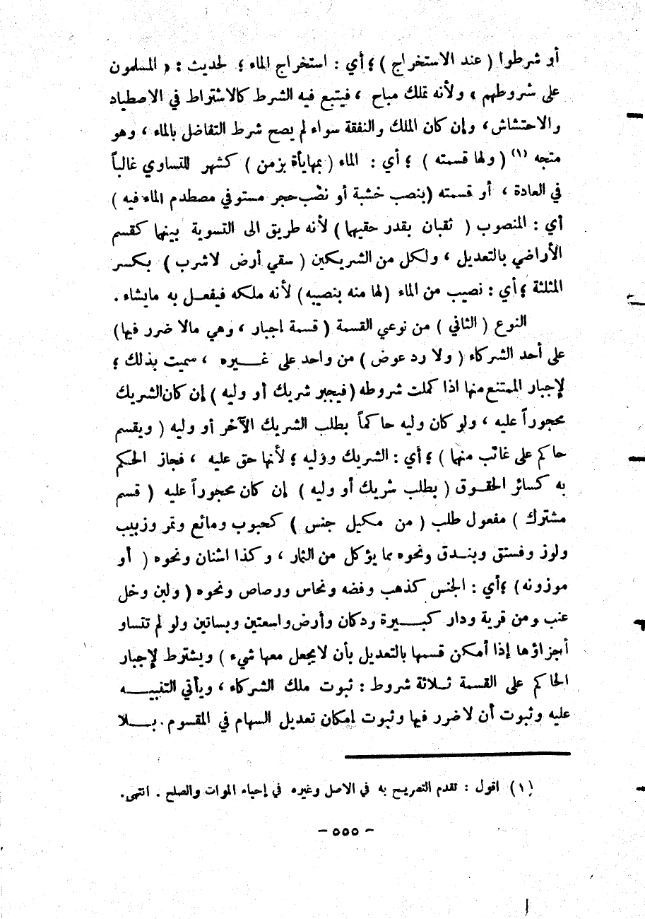 النَّوْعُ (الثَّانِي) مِنْ نَوْعَيْ الْقِسْمَةِ (قِسْمَةُ إجْبَارٍ، وَهِيَ مَا لَا ضَرَرَ فِيهَا) عَلَى أَحَدِ الشُّرَكَاءِ (وَلَا رَدَّ عِوَضٍ) مِنْ وَاحِدٍ عَلَى غَيْرِهِ، سُمِّيَتْ بِذَلِكَ؛ لِإِجْبَارِ الْمُمْتَنِعِ مِنْهَا إذَا كَمُلَتْ شُرُوطُهُ (فَيُجْبَرُ شَرِيكٌ أَوْ وَلِيُّهُ) إنْ كَانَ الشَّرِيكُ مَحْجُورًا عَلَيْهِ، وَلَوْ كَانَ وَلِيُّهُ حَاكِمَا بِطَلَبِ الشَّرِيكِ الْآخَرِ أَوْ وَلِيِّهِ (وَيَقْسِمُ حَاكِمٌ عَلَى غَائِبٍ مِنْهُمَا) ؛ أَيْ: الشَّرِيكِ وَوَلِيِّهِ؛ لِأَنَّهَا حَقٌّ عَلَيْهِ، فَجَازَ الْحُكْمُ بِهِ كَسَائِرِ الْحُقُوقِ (بِطَلَبِ شَرِيكٍ أَوْ وَلِيِّهِ) إنْ كَانَ مَحْجُورًا عَلَيْهِ (قَسْمَ مُشْتَرَكٍ) مَفْعُولُ طَلَبَ (مِنْ مَكِيلِ جِنْسٍ) كَحُبُوبٍ وَمَائِعٍ وَتَمْرٍ وَزَبِيبٍ وَلَوْزٍ وَفُسْتُقٍ وَبُنْدُقٍ وَنَحْوِهِ مِمَّا يُؤْكَلُ مِنْ الثِّمَارِ، وَكَذَا أُشْنَانُ وَنَحْوُهُ (أَوْ مَوْزُونِهِ) ؛ أَيْ: الْجِنْسِ كَذَهَبٍ وَفِضَّةٍ وَنُحَاسٍ وَرَصَاصٍ وَنَحْوِهِ (وَلَبَنٍ وَخَلِّ عِنَبٍ وَمِنْ قَرْيَةٍ وَدَارٍ كَبِيرَةٍ وَدُكَّانٍ وَأَرْضٍ وَاسِعَتَيْنِ وَبَسَاتِينَ وَلَوْ لَمْ تَتَسَاوَ أَجْزَاؤُهَا إذَا أَمْكَنَ قَسْمُهَا بِالتَّعْدِيلِ بِأَنْ لَا يُجْعَلَ مَعَهَا شَيْءٌ) وَيُشْتَرَطُ لِإِجْبَارِ الْحَاكِمِ عَلَى الْقِسْمَةِ ثَلَاثَةُ شُرُوطٍ: ثُبُوتُ مِلْكِ الشُّرَكَاءِ، وَيَأْتِي التَّنْبِيهُ عَلَيْهِ وَثُبُوتُ أَنْ لَا ضَرَرَ فِيهَا وَثُبُوتُ إمْكَانِ تَعْدِيلِ السِّهَامِ فِي الْمَقْسُومِ بِلَا