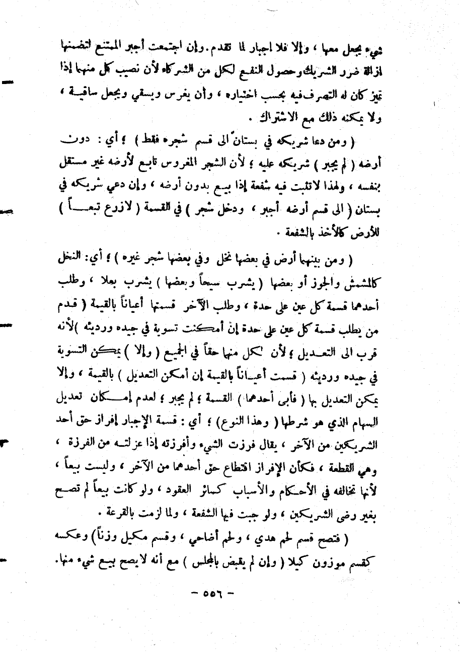 (وَمَنْ بَيْنَهُمَا أَرْضٌ فِي بَعْضِهَا نَخْلٌ وَفِي بَعْضِهَا شَجَرٌ غَيْرُهُ) ؛ أَيْ: النَّخْلِ كَالْمِشْمِشِ وَالْجَوْزِ أَوْ بَعْضُهَا (يَشْرَبُ سَيْحًا وَبَعْضُهَا) يَشْرَبُ بَعْلًا، وَطَلَبَ أَحَدُهُمَا قِسْمَةَ كُلِّ عَيْنٍ عَلَى حِدَةٍ، وَطَلَبَ الْآخَرُ قِسْمَتَهَا أَعْيَانًا بِالْقِيمَةِ (قُدِّمَ مَنْ يَطْلُبُ قِسْمَةَ كُلِّ عَيْنٍ عَلَى حِدَةٍ إنْ أَمْكَنَتْ تَسْوِيَةٌ فِي جَيِّدِهِ وَرَدِيئِهِ) لِأَنَّهُ قَرُبَ إلَى التَّعْدِيلِ؛ لِأَنَّ لِكُلٍّ مِنْهُمَا حَقًّا فِي الْجَمِيعِ (وَإِلَّا) يُمْكِنْ التَّسْوِيَةُ فِي جَيِّدِهِ وَرَدِيئِهِ (قُسِّمَتْ أَعْيَانًا بِالْقِيمَةِ إنْ أَمْكَنَ التَّعْدِيلُ) بِالْقِيمَةِ، وَإِلَّا يُمْكِنْ التَّعْدِيلُ بِهَا (فَأَبَى أَحَدُهُمَا) الْقِسْمَةَ؛ لَمْ يُجْبَرْ؛ لِعَدَمِ إمْكَانِ تَعْدِيلِ السِّهَامِ الَّذِي هُوَ شَرْطُهَا (وَهَذَا النَّوْعُ) ؛ أَيْ: قِسْمَةُ الْإِجْبَارِ إفْرَازُ حَقِّ أَحَدِ الشَّرِيكَيْنِ مِنْ الْآخَرِ، يُقَالُ فَرَزْت الشَّيْءَ وَأَفْرَزْته إذَا عَزَلْته مِنْ الْفِرْزَةِ، وَهِيَ الْقِطْعَةُ، فَكَأَنَّ الْإِفْرَازَ اقْتِطَاعُ حَقِّ أَحَدِهِمَا مِنْ الْآخَرِ، وَلَيْسَتْ بَيْعًا، لِأَنَّهَا تُخَالِفُهُ فِي الْأَحْكَامِ وَالْأَسْبَابِ كَسَائِرِ الْعُقُودِ، وَلَوْ كَانَتْ بَيْعًا لَمْ تَصِحَّ بِغَيْرِ رِضَى الشَّرِيكَيْنِ، وَلَوَجَبَتْ فِيهَا الشُّفْعَةُ، وَلَمَا لَزِمَتْ بِالْقُرْعَةِ.