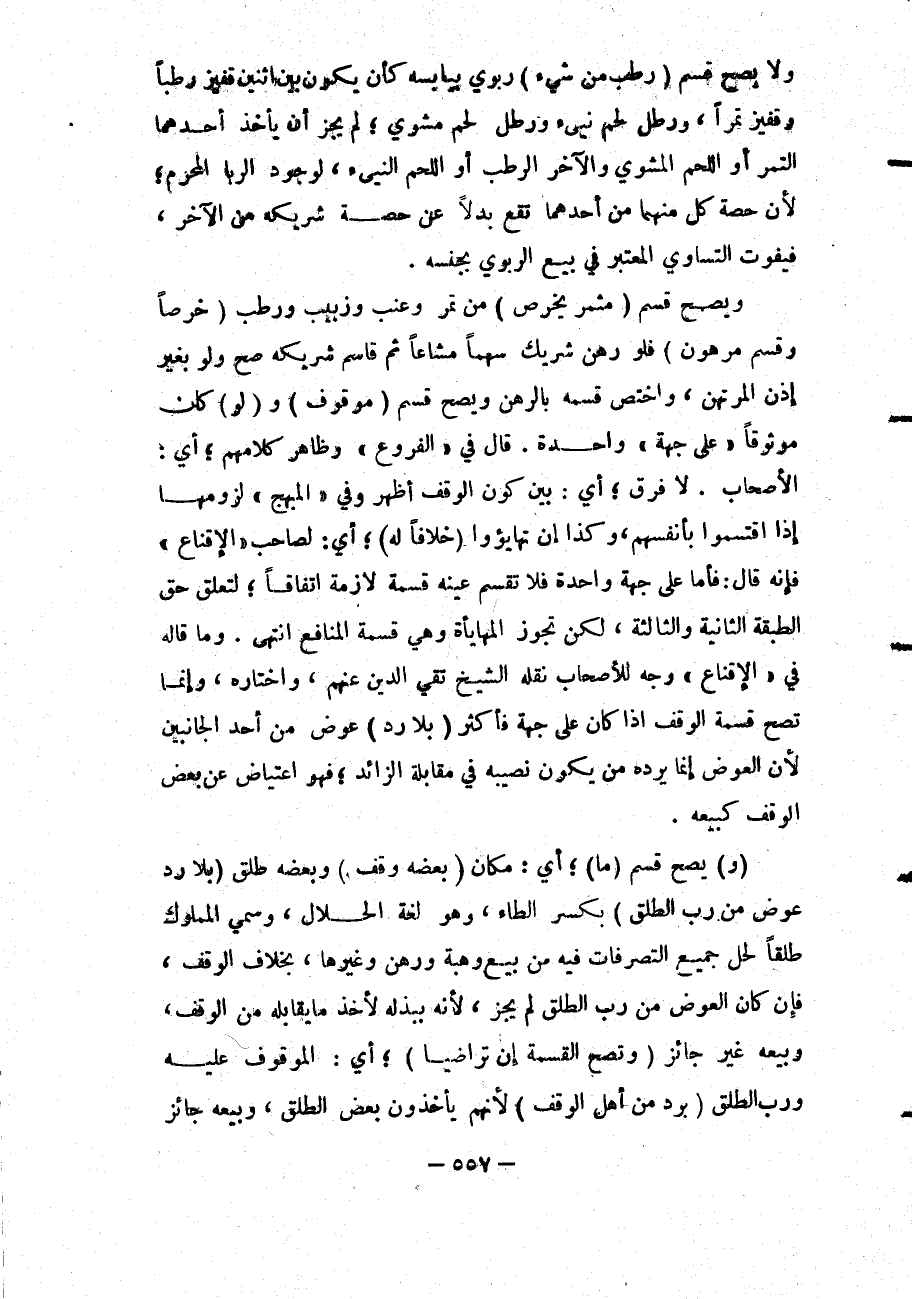 وَلَا يَصِحُّ قَسْمُ (رَطْبٍ مِنْ شَيْءٍ) رِبَوِيٍّ بِيَابِسِهِ كَأَنْ يَكُونَ بَيْنَ اثْنَيْنِ قَفِيزٌ رُطَبًا وَقَفِيزٌ تَمْرًا، وَرَطْلُ لَحْمٍ نِيءٍ وَرَطْلُ لَحْمٍ مَشْوِيٍّ؛ لَمْ يَجُزْ أَنْ يَأْخُذَ أَحَدُهُمَا التَّمْرَ أَوْ اللَّحْمَ الْمَشْوِيَّ وَالْآخَرُ الرُّطَبَ أَوْ اللَّحْمَ النِّيءَ، لِوُجُودِ الرِّبَا الْمُحَرَّمِ؛ لِأَنَّ حِصَّةَ كُلٍّ مِنْهُمَا مِنْ أَحَدِهِمَا تَقَعُ بَدَلًا عَنْ حِصَّةِ شَرِيكِهِ مِنْ الْآخَرِ، فَيَفُوتُ التَّسَاوِي الْمُعْتَبَرُ فِي بَيْعِ الرِّبَوِيِّ بِجِنْسِهِ.