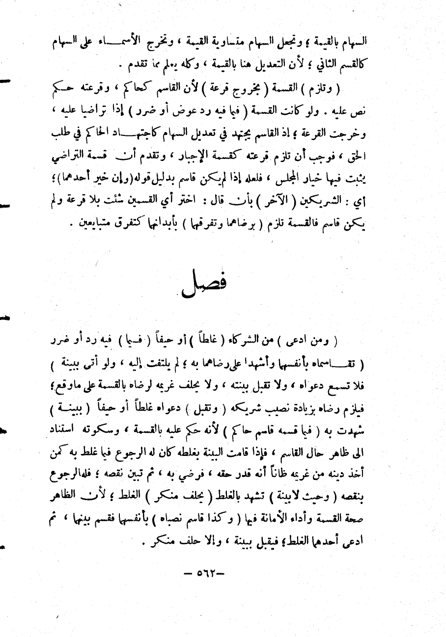 فَصْلٌ (وَمَنْ ادَّعَى) مِنْ الشُّرَكَاءِ (غَلَطًا) أَوْ حَيْفًا (فِيمَا) فِيهِ رَدٌّ أَوْ ضَرَرٌ (تَقَاسَمَاهُ بِأَنْفُسِهِمَا وَأَشْهَدَا عَلَى رِضَاهُمَا بِهِ؛ لَمْ يُلْتَفَتْ إلَيْهِ، وَلَوْ أَتَى بِبَيِّنَةٍ) فَلَا تُسْمَعُ دَعْوَاهُ، وَلَا تُقْبَلُ بَيِّنَتُهُ، وَلَا يُحَلَّفُ غَرِيمُهُ لِرِضَاهُ بِالْقِسْمَةِ عَلَى مَا وَقَعَ؛ فَيَلْزَمُ رِضَاهُ بِزِيَادَةِ نَصِيبِ شَرِيكِهِ (وَتُقْبَلُ) دَعْوَاهُ غَلَطًا أَوْ حَيْفًا (بِبَيِّنَةٍ) شَهِدَتْ بِهِ (فِيمَا قَسَّمَهُ قَاسِمُ حَاكِمٍ) لِأَنَّهُ حَكَمَ عَلَيْهِ بِالْقِسْمَةِ، وَسُكُوتُهُ اسْتِنَادٌ إلَى ظَاهِرِ حَالِ الْقَاسِمِ، فَإِذَا قَامَتْ الْبَيِّنَةُ بِغَلَطِهِ كَانَ لَهُ الرُّجُوعُ فِيمَا غَلِطَ بِهِ كَمَنْ أَخَذَ دَيْنَهُ مِنْ غَرِيمِهِ ظَانًّا أَنَّهُ قَدْرُ حَقِّهِ، فَرَضِيَ بِهِ، ثُمَّ تَبَيَّنَ نَقْصُهُ؛ فَلَهُ الرُّجُوعُ بِنَقْصِهِ (وَحَيْثُ لَا بَيِّنَةَ) تَشْهَدُ بِالْغَلَطِ (يُحَلَّفُ مُنْكِرُ) الْغَلَطِ؛ لِأَنَّ الظَّاهِرَ صِحَّةُ الْقِسْمَةِ وَأَدَاءُ الْأَمَانَةِ فِيهَا (وَكَذَا قَاسِمٌ نَصَبَاهُ) بِأَنْفُسِهِمَا فَقَسَمَ بَيْنَهُمَا، ثُمَّ ادَّعَى أَحَدُهُمَا الْغَلَطَ؛ فَيُقْبَلُ بِبَيِّنَةٍ، وَإِلَّا حُلِّفَ مُنْكِرٌ.