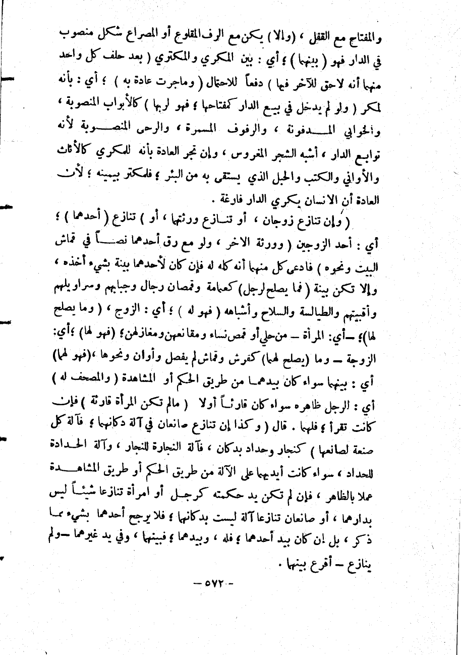 وَالْمِفْتَاحِ مَعَ الْقُفْلِ، (وَإِلَّا) يَكُنْ مَعَ الرَّفِّ الْمَقْلُوعِ أَوْ الْمِصْرَاعِ شَكْلٌ مَنْصُوبٌ فِي الدَّارِ فَهُوَ (بَيْنَهُمَا) ؛ أَيْ: بَيْنَ الْمُكْرِي وَالْمُكْتَرِي (بَعْدَ حَلِفِ كُلِّ وَاحِدٍ مِنْهُمَا أَنَّهُ لَا حَقَّ لِلْآخَرِ فِيهَا) دَفْعًا لِلِاحْتِمَالِ (وَمَا جَرَتْ عَادَةٌ بِهِ) ؛ أَيْ: بِأَنَّهُ لِمُكْرٍ (وَلَوْ لَمْ يَدْخُلْ فِي بَيْعِ الدَّارِ كَمِفْتَاحِهَا؛ فَهُوَ لِرَبِّهَا) كَالْأَبْوَابِ الْمَنْصُوبَةِ، وَالْخَوَابِي الْمَدْفُونَةِ، وَالرُّفُوفِ الْمُسَمَّرَةِ، وَالرَّحَى الْمَنْصُوبَةِ لِأَنَّهُ تَوَابِعُ الدَّارِ، أَشْبَهَ الشَّجَرَ الْمَغْرُوسَ، وَإِنْ تَجْرِ الْعَادَةُ بِأَنَّهُ لِلْمُكْرِي كَالْأَثَاثِ وَالْأَوَانِي وَالْكُتُبِ وَالْحَبْلِ الَّذِي يُسْتَقَى بِهِ مِنْ الْبِئْرِ؛ فَلِمُكْتَرٍ بِيَمِينِهِ؛ لِأَنَّ الْعَادَةَ أَنَّ الْإِنْسَانَ يُكْرِي الدَّارَ فَارِغَةً.