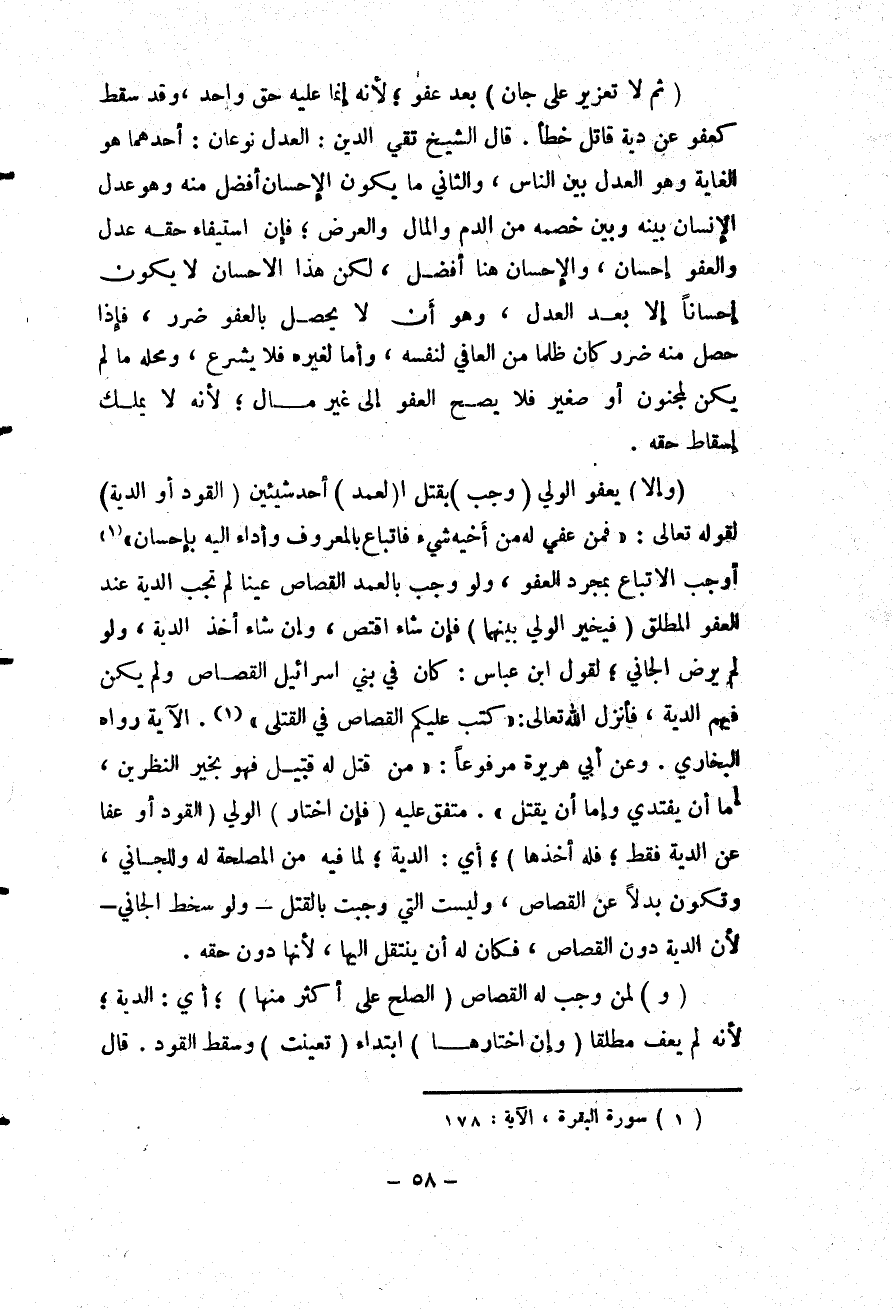قَالَ الشَّيْخُ تَقِيُّ الدِّينِ: الْعَدْلُ نَوْعَانِ: أَحَدُهُمَا: هُوَ الْغَايَةُ وَهُوَ الْعَدْلُ بَيْنَ النَّاسِ. وَالثَّانِي: مَا يَكُونُ الْإِحْسَانُ أَفْضَلَ مِنْهُ وَهُوَ عَدْلُ الْإِنْسَانِ بَيْنَهُ وَبَيْنَ خَصْمِهِ مِنْ الدَّمِ وَالْمَالِ وَالْعِرْضِ؛ فَإِنَّ اسْتِيفَاءَ حَقِّهِ عَدْلٌ وَالْعَفْوَ إحْسَانٌ، وَالْإِحْسَانُ هُنَا أَفْضَلُ، لَكِنَّ هَذَا الْإِحْسَانَ لَا يَكُونُ إحْسَانًا إلَّا بَعْدَ الْعَدْلِ، وَهُوَ أَنْ لَا يَحْصُلَ بِالْعَفْوِ ضَرَرٌ، فَإِذَا حَصَلَ مِنْهُ ضَرَرٌ؛ كَانَ ظُلْمًا مِنْ الْعَافِي لِنَفْسِهِ، وَإِمَّا لِغَيْرِهِ فَلَا يُشْرَعُ، وَمَحَلُّهُ مَا لَمْ يَكُنْ لِمَجْنُونٍ أَوْ صَغِيرٍ فَلَا يَصِحُّ الْعَفْوُ إلَى غَيْرِ مَالٍ؛ لِأَنَّهُ لَا يَمْلِكُ إسْقَاطَ حَقِّهِ.