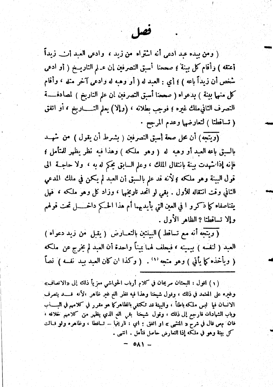 فَصْلٌ (وَمَنْ بِيَدِهِ عَبْدٌ ادَّعَى أَنَّهُ اشْتَرَاهُ مِنْ زَيْدٍ، وَادَّعَى الْعَبْدُ أَنْ زَيْدًا أَعْتَقَهُ) وَأَقَامَ كُلٌّ بَيِّنَةً؛ صَحَّحْنَا أَسْبَقَ التَّصَرُّفَيْنِ إنْ عُلِمَ التَّارِيخُ (أَوْ ادَّعَى شَخْصٌ أَنَّ زَيْدًا بَاعَهُ) أَيْ: الْعَبْدَ لَهُ (أَوْ وَهَبَهُ لَهُ وَادَّعَى آخَرُ مِثْلَهُ، وَأَقَامَ كُلٌّ مِنْهُمَا بَيِّنَةً) بِدَعْوَاهُ (صَحَّحْنَا أَسْبَقَ التَّصَرُّفَيْنِ إنْ عُلِمَ التَّارِيخُ) لِمُصَادَفَةِ التَّصَرُّفِ الثَّانِي مِلْكَ غَيْرِهِ، فَوَجَبَ بُطْلَانُهُ، (وَإِلَّا) يُعْلَمْ التَّارِيخُ، أَوْ اتَّفَقَ (تَسَاقَطَتَا) لِتَعَارُضِهِمَا وَعَدَمِ الْمُرَجِّحِ.